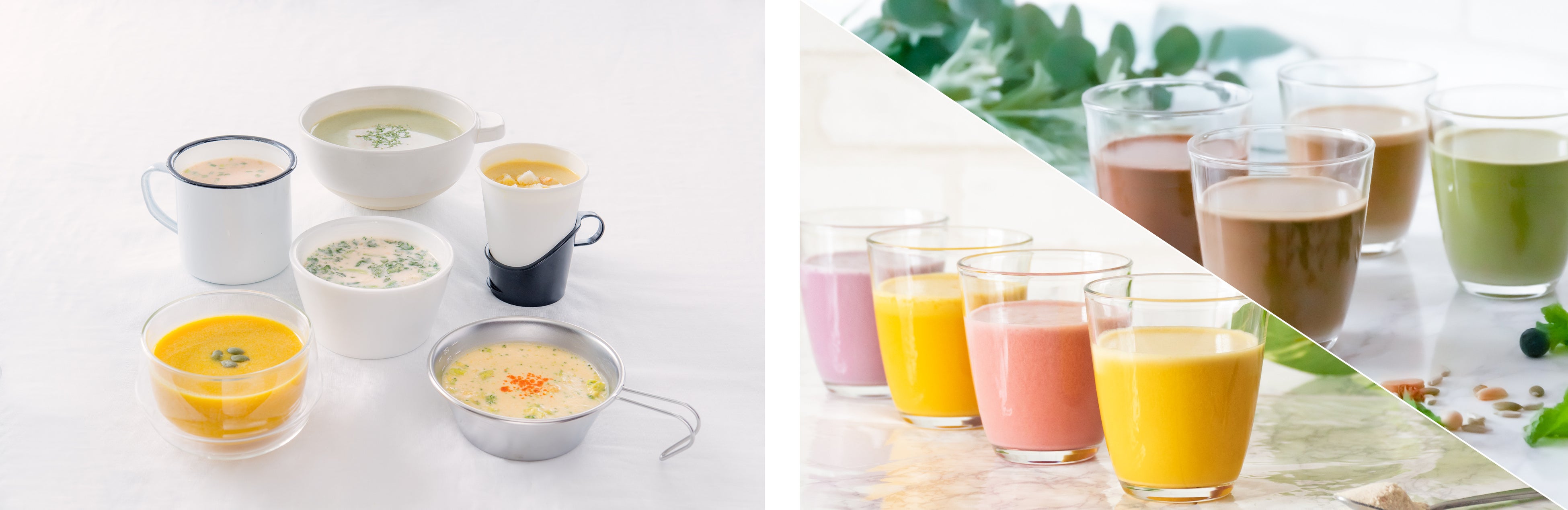 「エクサスリムLCDプロテイン」では、今回、Makuakeで先行予約販売が開始となった2種類のフレーバーを加えると、スープタイプ6種類とドリンクタイプ8種類の、計14種類のラインナップをご提供することとなります。