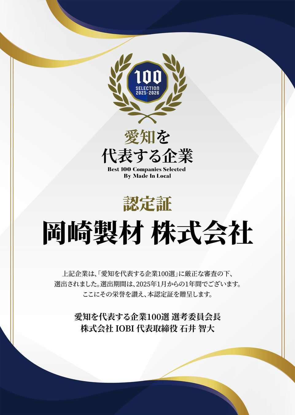 岡崎製材株式会社が、地方創生メディア「Made In Local」の選定する「地域を代表する企業100選」にて、愛知エリアの企業100選の認定を受けました。