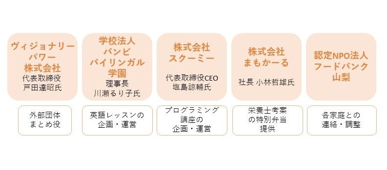 2023年度はこのうち20名の子どもに、ヴィジョナリーパワー(株)・バンビバイリンガル学園・(株)スクーミーなど県内企業と連携し、プログラミング・英語の学びの機会を提供しています。