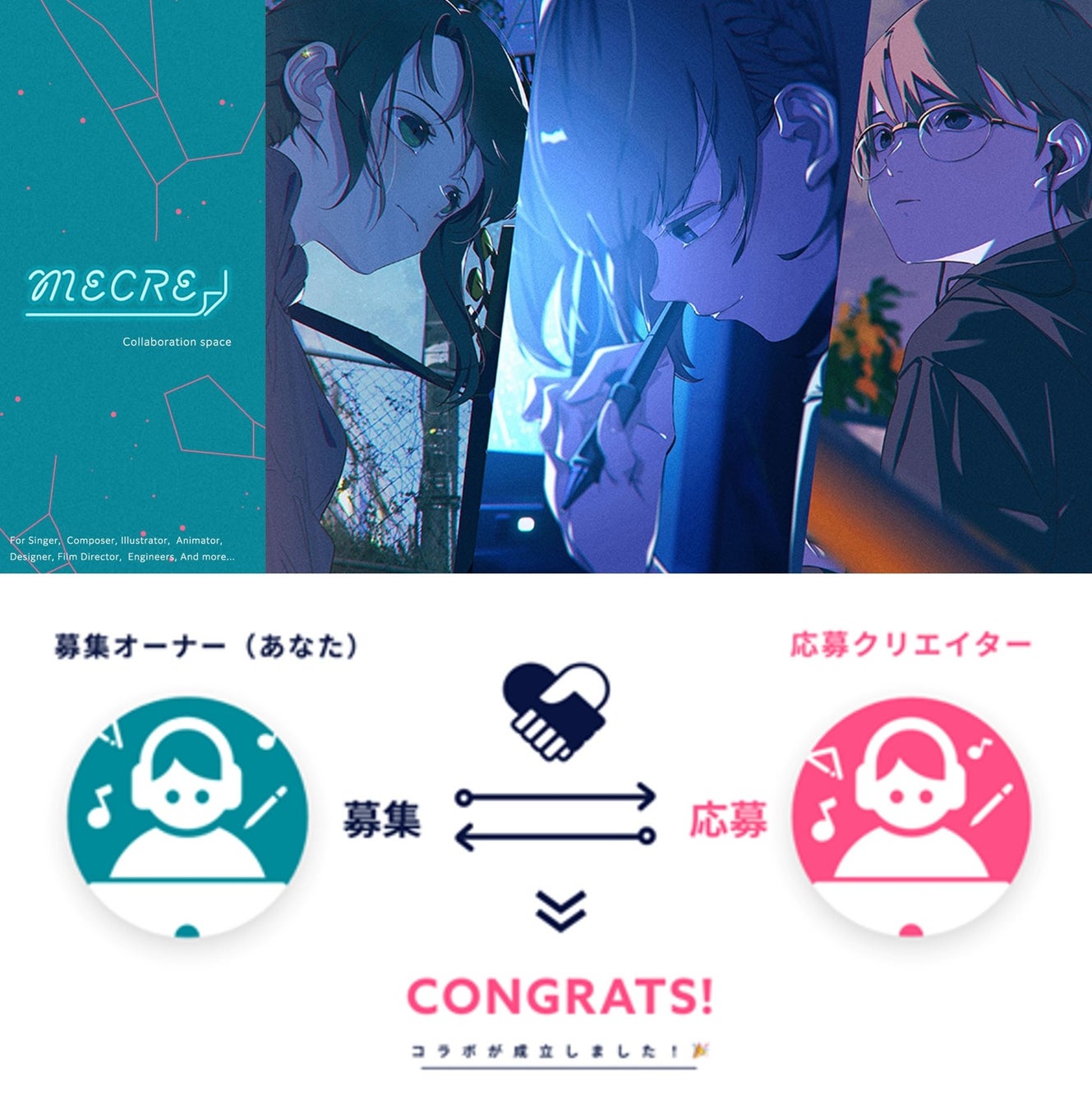 「MECRE(メクル)」は、クリエイターが創作パートナーを自由に探して出逢い、コンテンツ制作の可能性を広げることができるプラットフォームサービスです。本コラボ企画では、「The VOCALOID Collection ~2022 Spring~」の「ルーキーランキング」と「歌ってみた Collection」の「Top100ランキング」の上位10名にランクインしたクリエイターに対し、MECREのロイヤリティユーザー権限を付与します。ロイヤリティユーザーがMECREを使って制作した音源は、ソニー・ミュージックレーベルズからリリースすることもでき、クリエイターは活躍の場をさらに広げることができます。