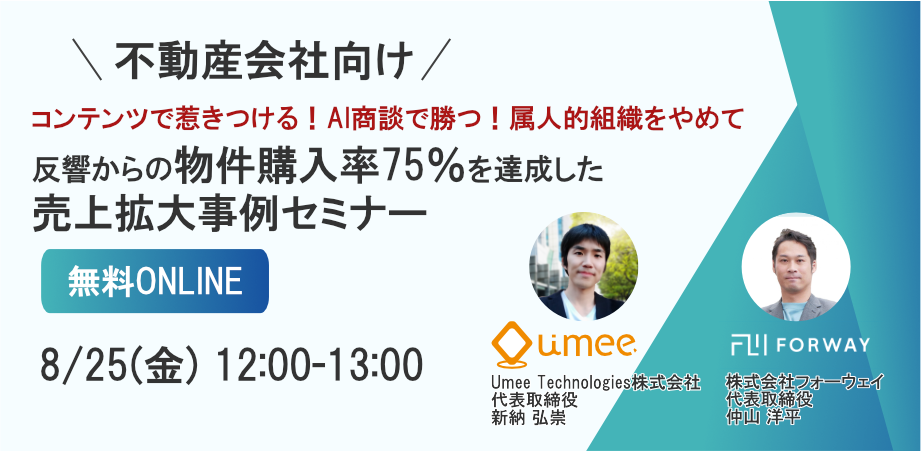 【不動産会社向け】属人的組織をやめたら“反響からの物件購入率75%“を達成した売上拡大事例セミナー、フォーウェイ社とウェビナーを共催決定