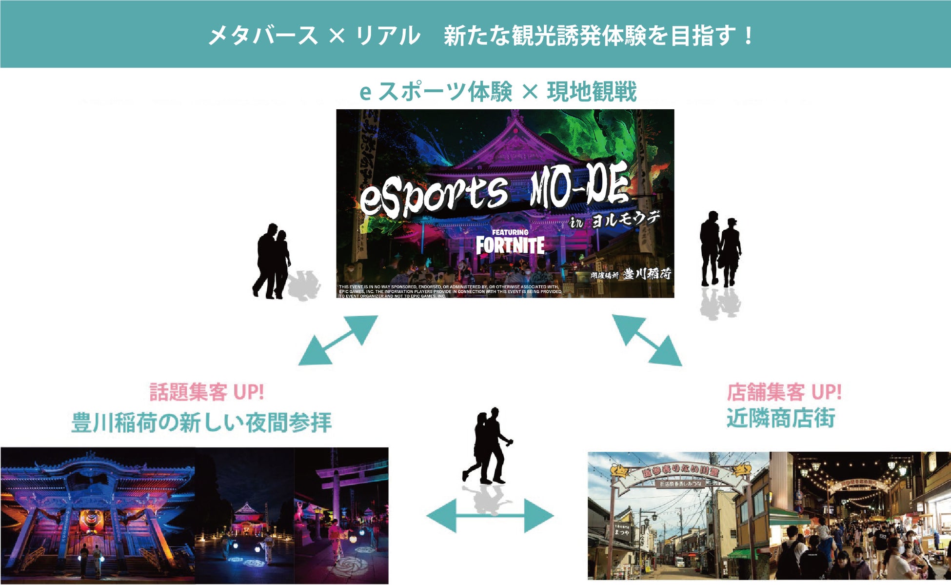 華やかなデジタルアートにより幻想的にショーアップされた豊川稲荷を会場にオンラインFORTNITE大会の開催や、豊川稲荷を精巧に再現したメタバース制作によるオンライン観光、メタバース空間内でのミニゲームを用いたエキシビジョンマッチ等を開催します。豊川稲荷の現地参加者はもちろん、世界中からもオンラインで参加いただけるイベントです。