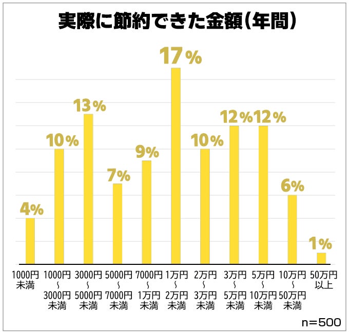 最も多いのは1万円〜2万円でした。月額にすると1,000円ほどだと思われますが、ほんの少し意識するだけでもこのくらいは節約できるということでしょう。
