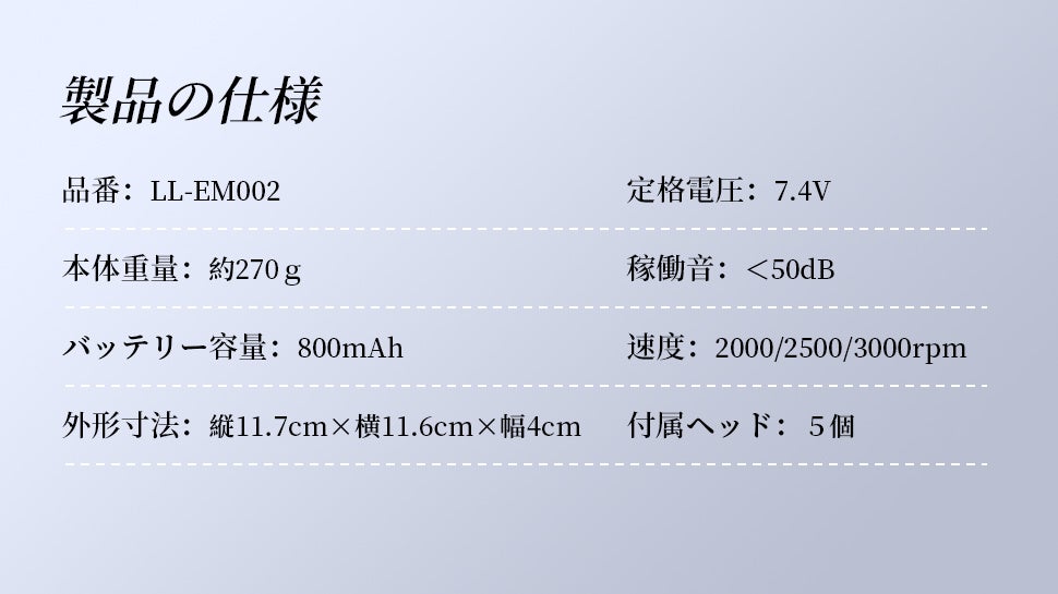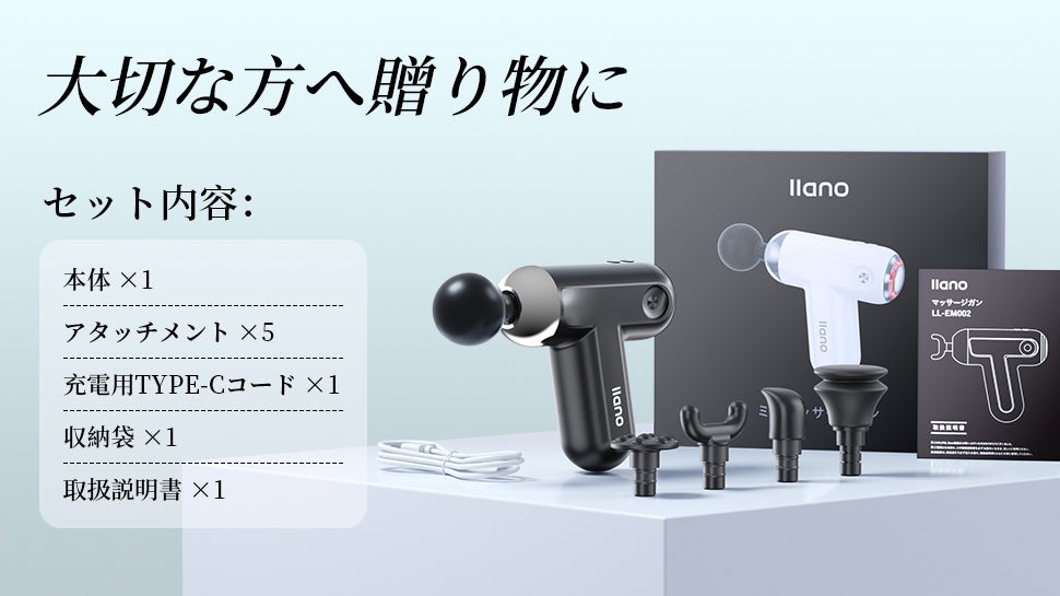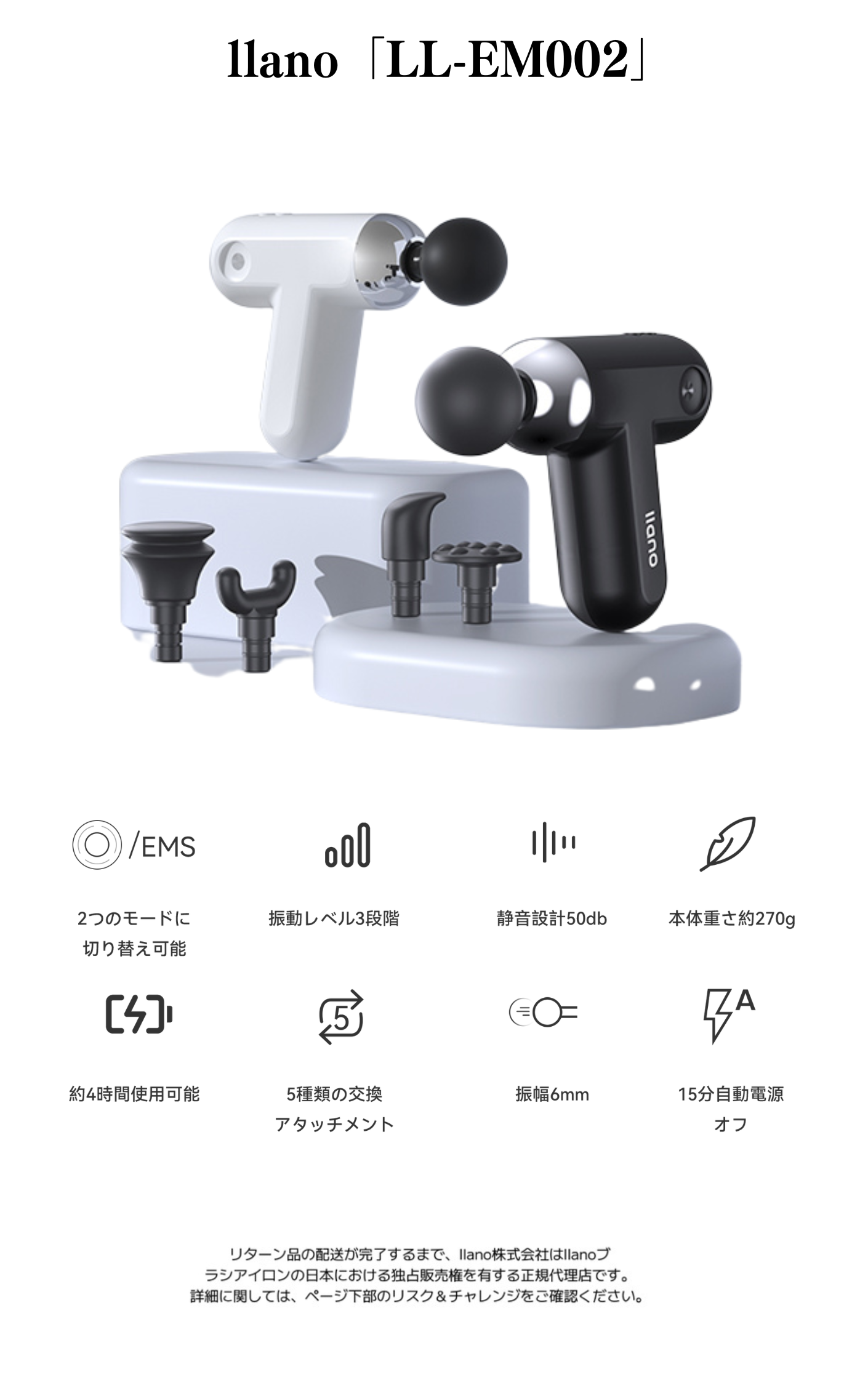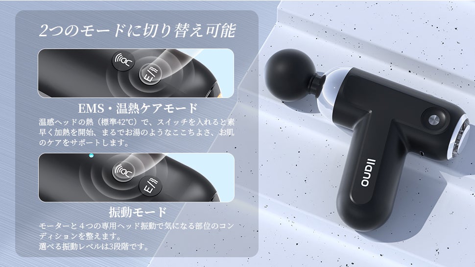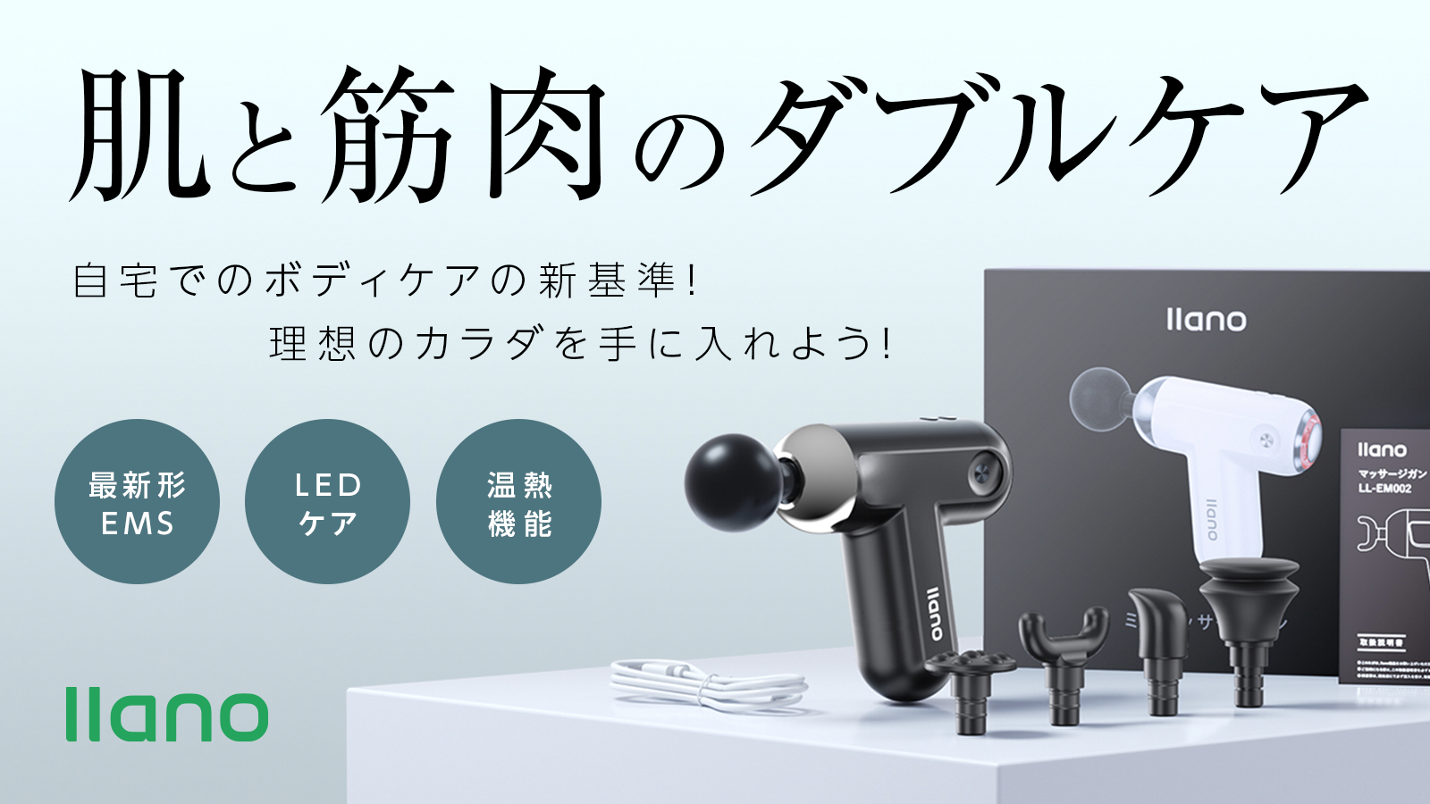 「llano LL-EM002」は振動、温熱、EMSが一体化した革新的なミニボディケアガンです。パワフルなモーター、振動吸収技術、静音設計、3段階の力調節機能を備えています。さらに、身体の筋肉ケアに加えて、熱敷とEMS機能を実現します。