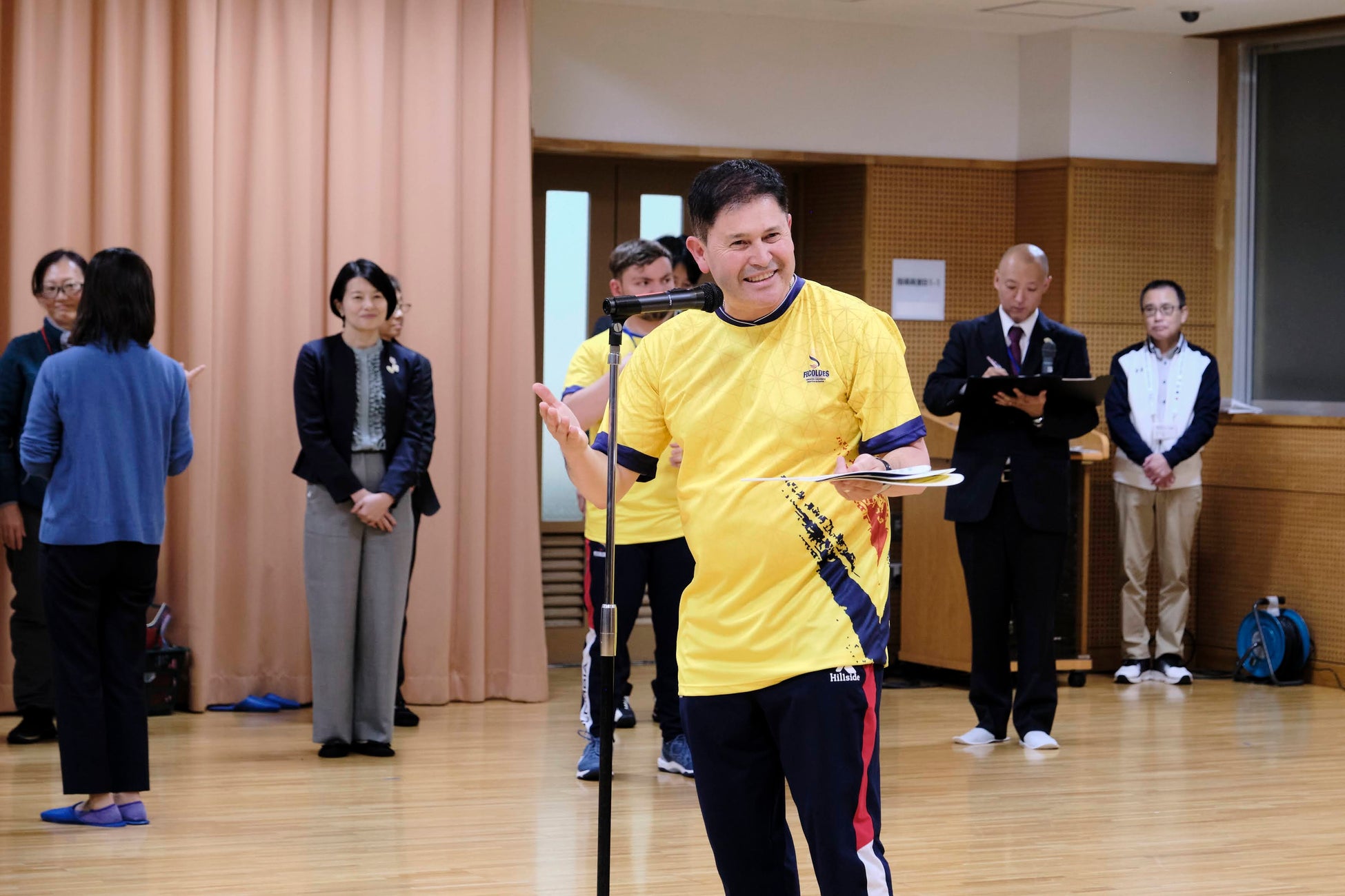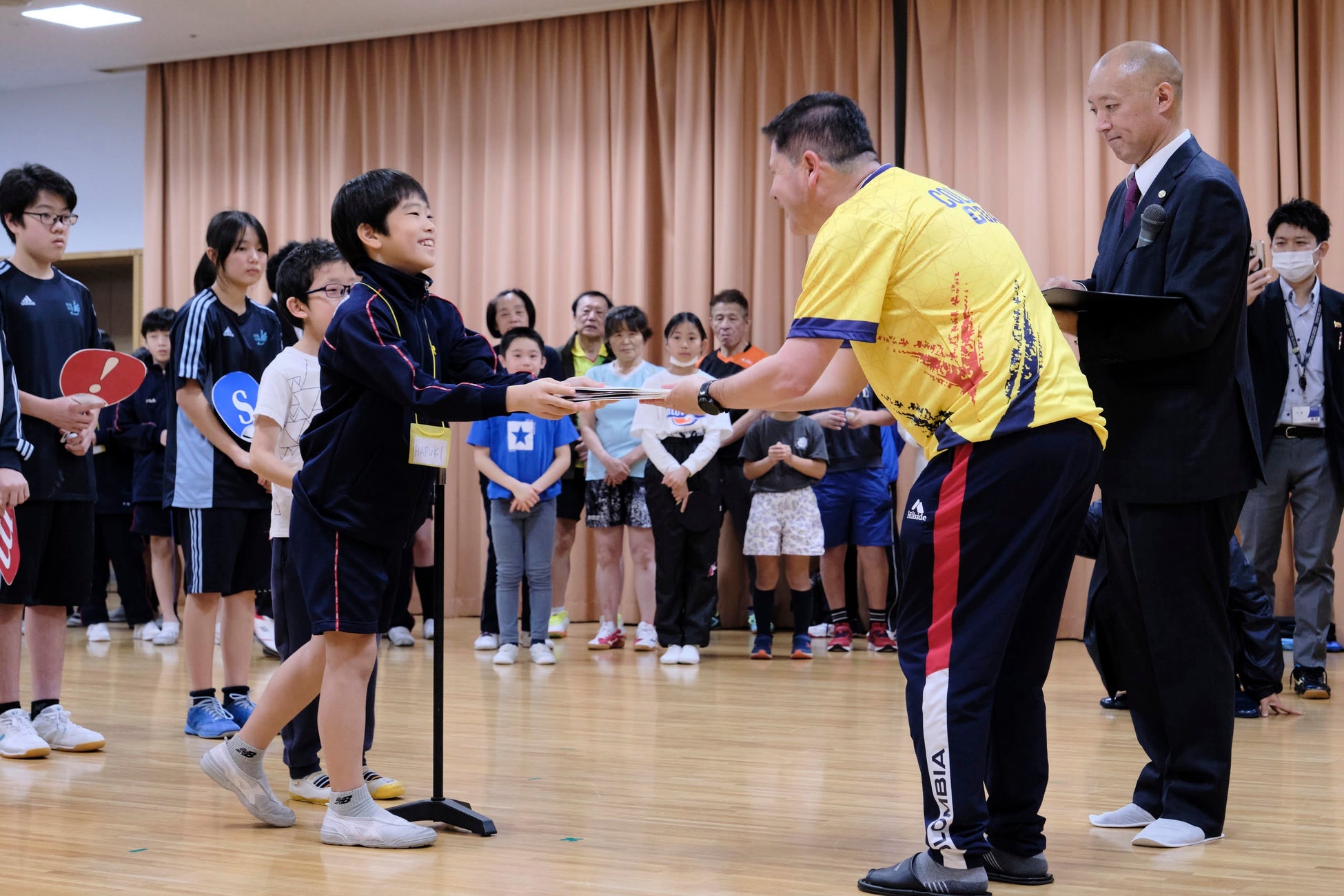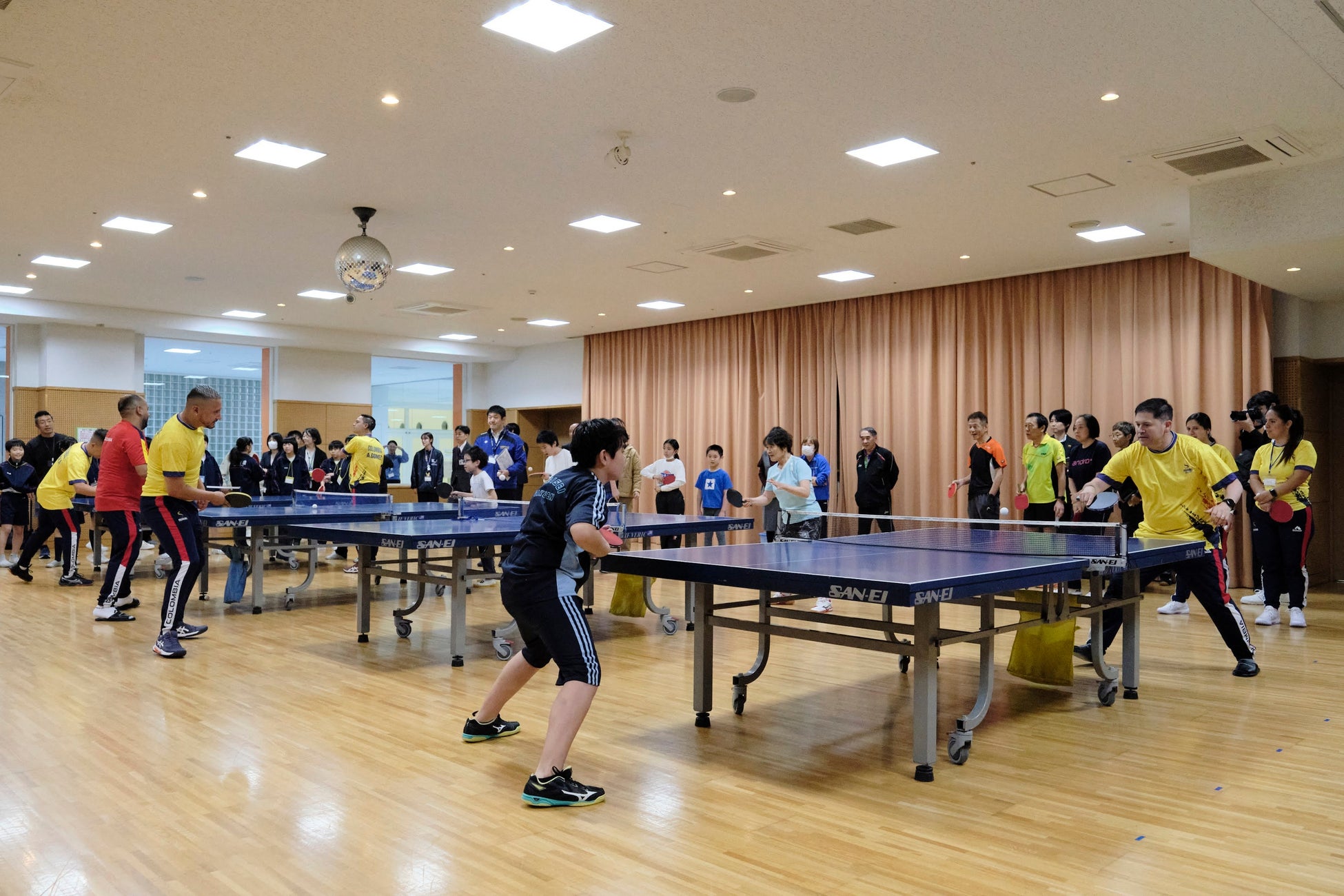 公開練習および地域住民との卓球交流会の会場となった品川区立総合体育館には、日本で唯一のバイリンガル・バイカルチュラルろう教育を行う私立特別支援学校・明晴学園の生徒たち、品川区立日野学園の児童たち、品川区卓球連盟が参加。森澤恭子区長も駆けつけ、激励の挨拶とともに自身も選手と卓球を楽しみました。