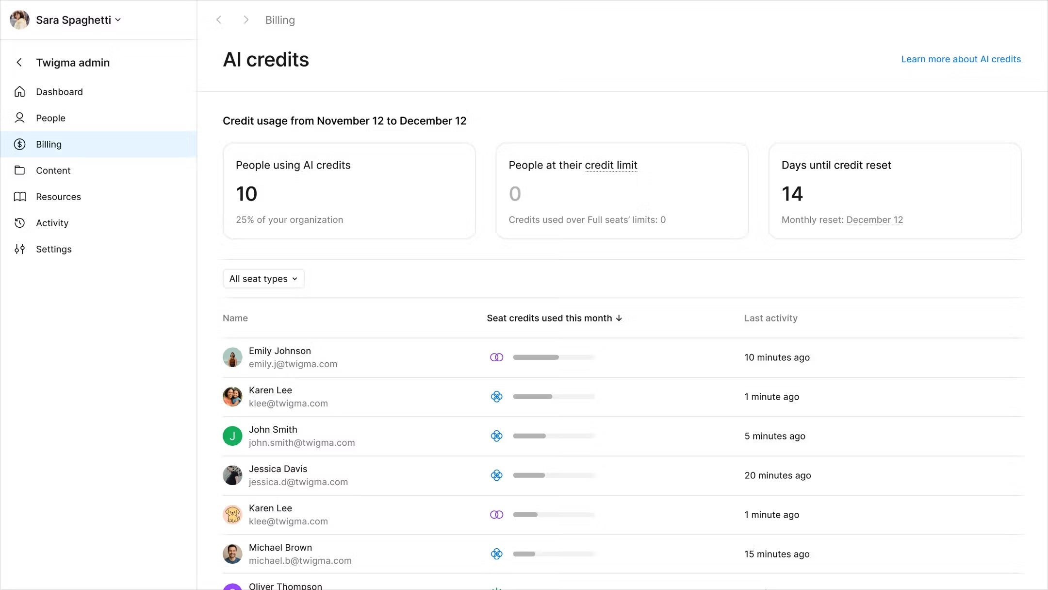AI機能の利用に関しては、AIクレジットの使用状況を追跡できる新しい仕組みを提供します。Figmaでは、すべてのユーザーがAI機能を活用できるよう、今年初めに、すべてのFigmaのシートおよびプランにAIクレジットを導入しました。今回のアップデートにより、管理者は請求ダッシュボードからチーム全体のAIクレジット使用状況を確認でき、個人ユーザーは自身のクレジット残高やリセット時期を把握できるようになります。多くのAI機能においては、各アクションでどれだけクレジット消費されたかも確認可能です。