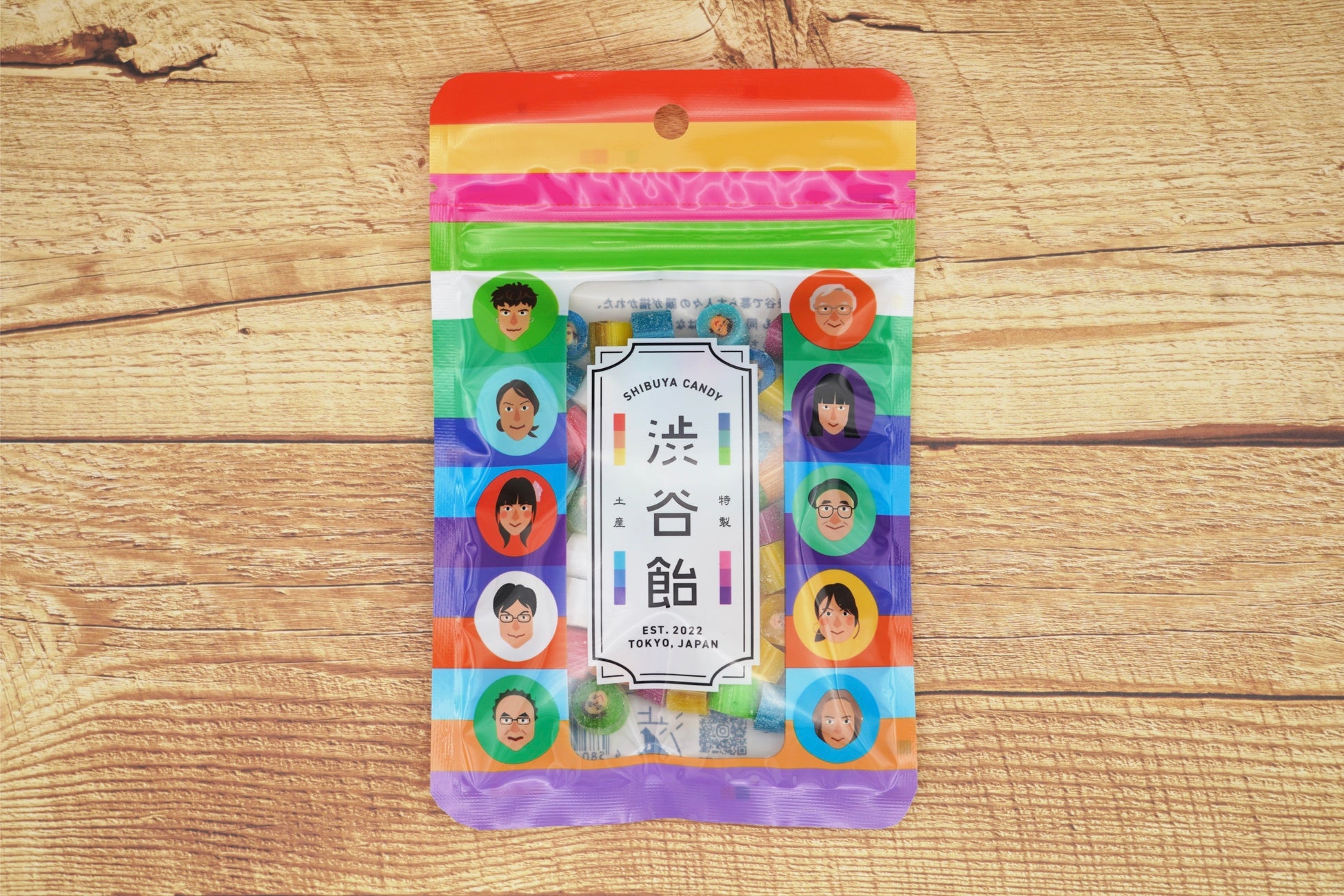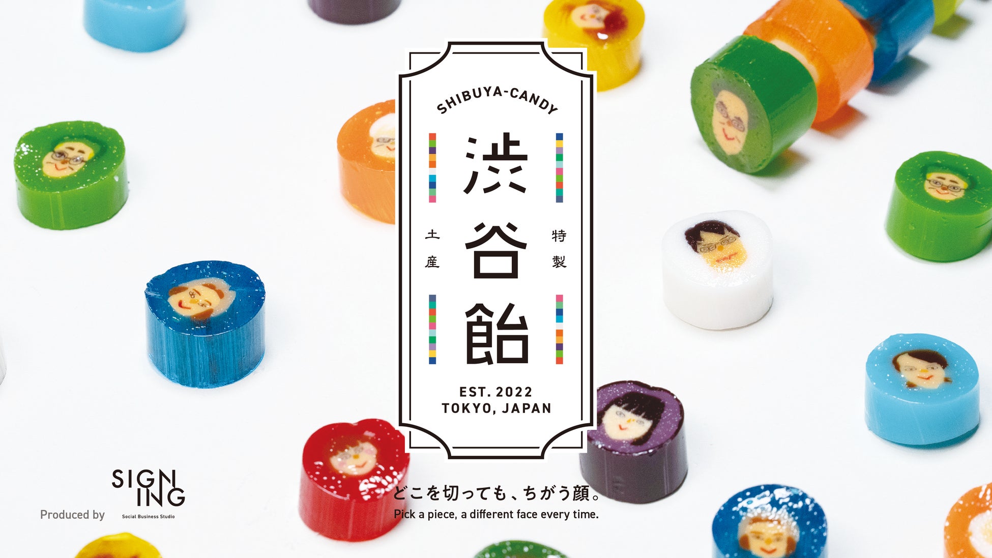 渋谷で暮らす人々の顔が描かれた、「どこを切っても同じ顔」ではなく「どこを切ってもちがう顔」のキャンディーです。