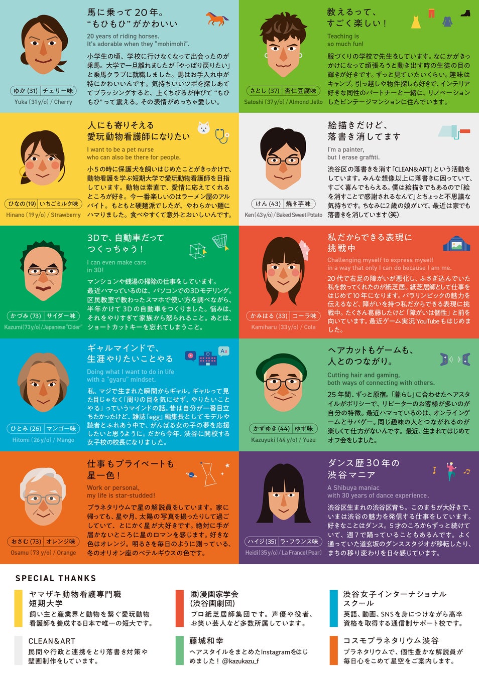 商品化にあたって、渋谷区に暮らす、様々な個性を持った10人の方々に取材を行い、飴を制作しました。世代や性別、肩書や属性もちがう様々な方のちがいをぜひ味わってみてください。