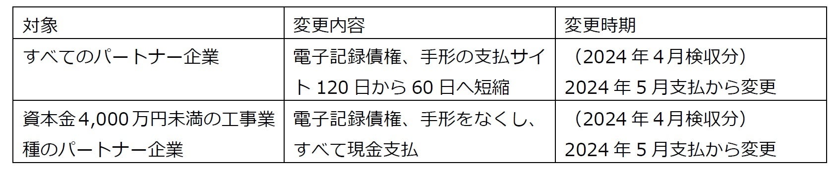 また、資本金4,000万円未満のパートナー企業への支払をすべて現金支払(銀行振込)に変更します。