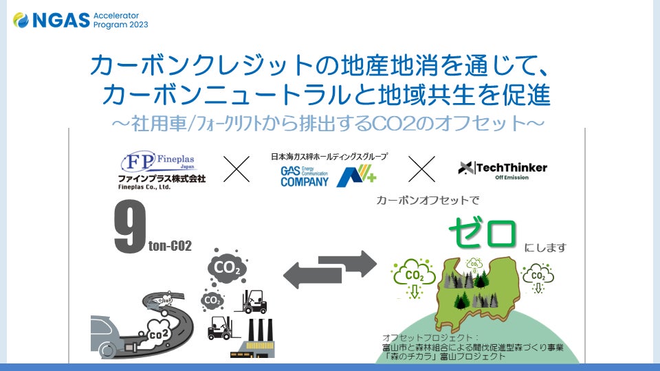 本事業では、事業活動のカーボンニュートラル化に向けたアクションを企画するとともに、地域で創出されたカーボンクレジットを活用したCO2オフセットを行うことで、脱炭素と地域共生の両立を目指します。なお、本事業は「NGAS-Accelerator Program 2023」の一環として実施いたしました。