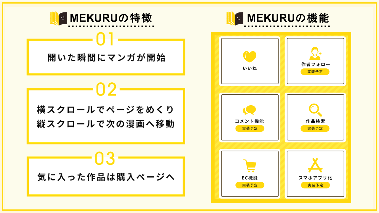 誰もがクリエイターを名乗り自由に発信できる時代のため、多くの名作マンガがネットの海に埋もれてしまっています。全ての作品が露出される「MEKURU」では、知名度や作家歴は関係ありません。あなたのマンガを求めている誰かに、必ず出会えます。