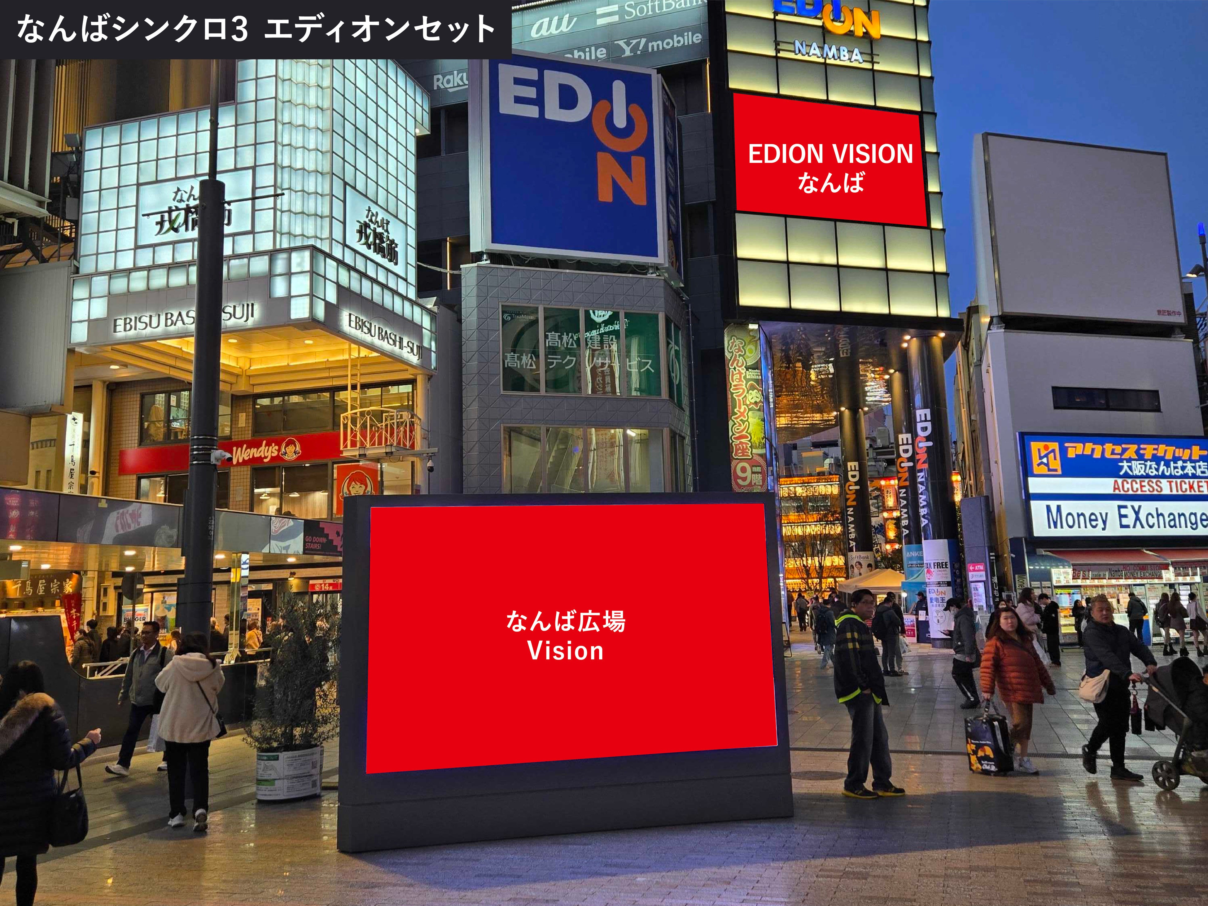 また、動画放映開始に合わせ、近隣の屋外ビジョン「EDION VISIONなんば」と連動した「シンクロ放映メニュー」の販売を開始。ミナミの象徴的な公共空間を、複数ビジョンによる動画放映でジャックする、インパクトのあるOOHメディアを提供してまいります。
