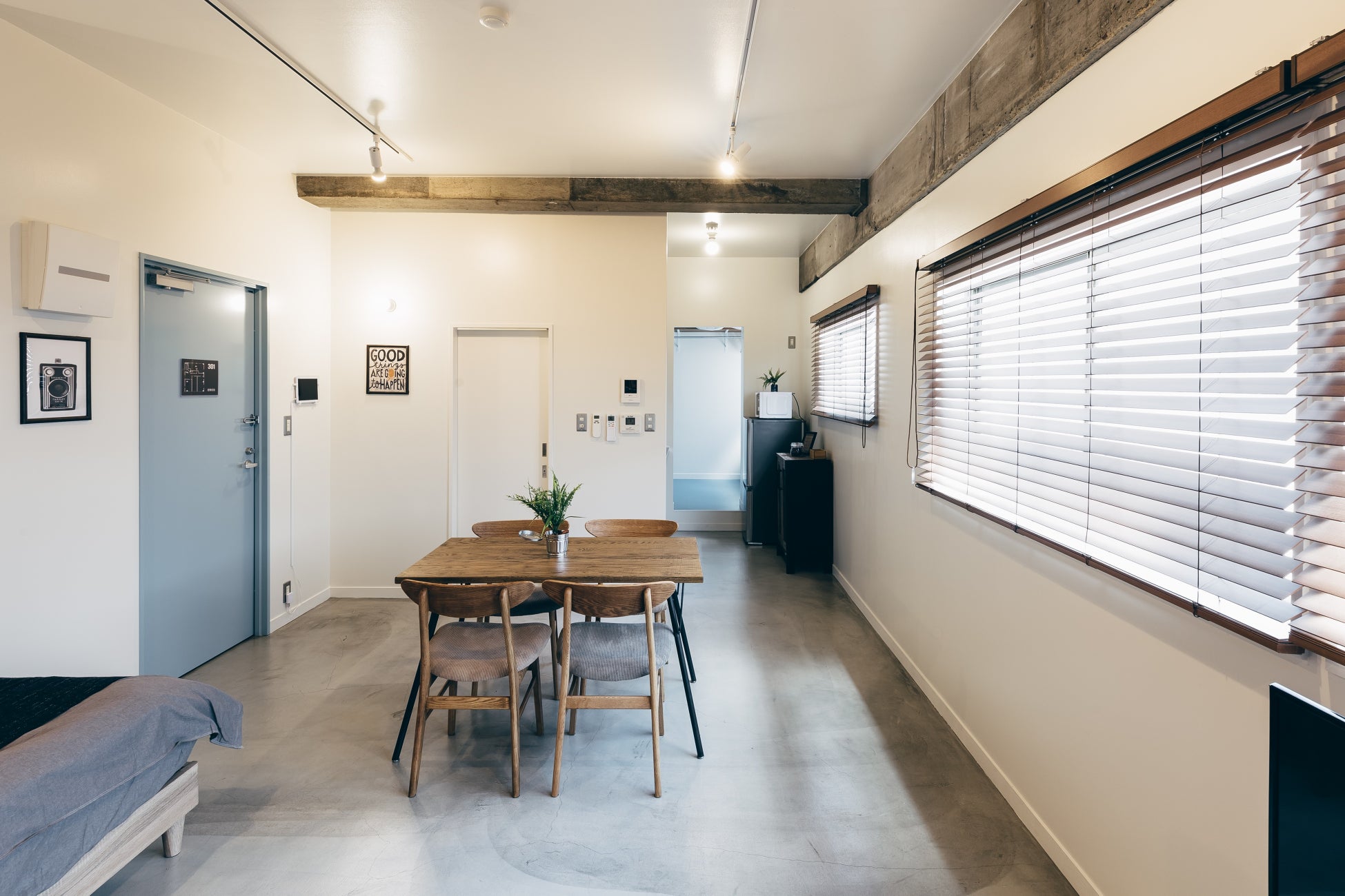また、事務所ビルをリノベーションし、武骨な雰囲気を活かしたブルックリンスタイルのお部屋となっております。当施設は、日当たりの良い空間と、カフェ風の共有スペースを備え、お客様に快適な環境を提供します。