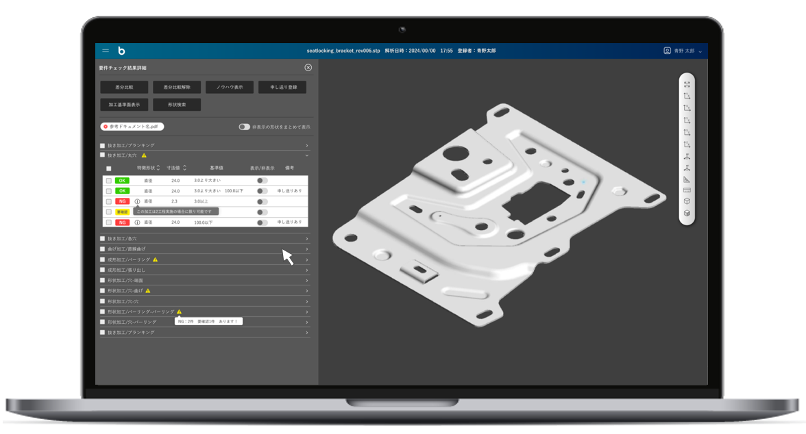 3D形状と各種ナレッジを紐づけることで、投入された3DCADデータから熟達者のノウハウの提示、類似部品検索、自動ルールチェックなどが可能となります。これにより過去の経験から重要管理が必要な形状、製造要件チェックに必要な形状などを把握し、検討漏れを未然に防ぐことで、設計から製造の手戻りなどを削減。検討工程でのリードタイムを大幅に短縮いたします。