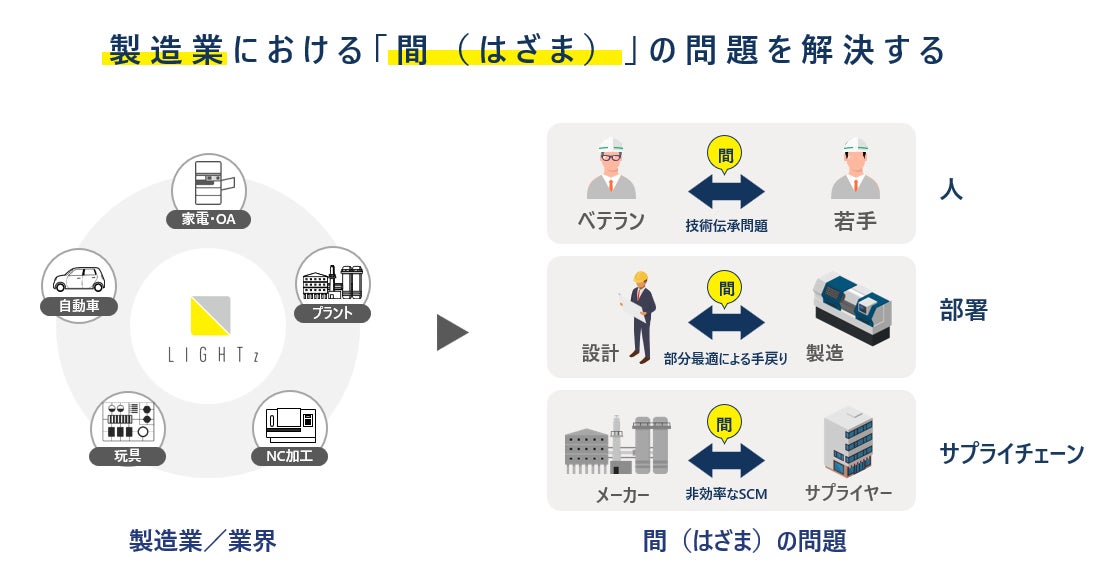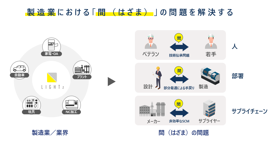 多くの製造業において、ベテラン社員と若手の間、設計と製造の間、メーカーとサプライヤーの間には、複雑に絡み合った問題が多数存在しています。LIGHTzはそれらの問題を解決することをミッションに掲げ、独自技術である、「汎知化」技術や「ブレインモデル」テクノロジーを活用し、多くの企業を支援してまいりました。