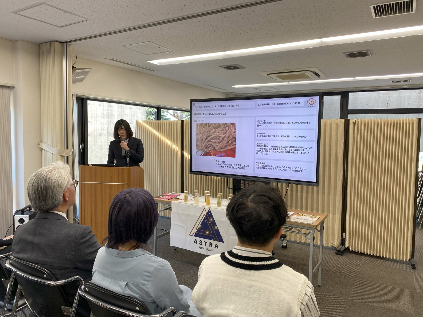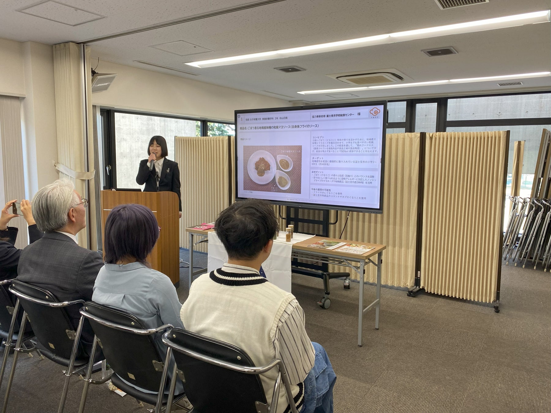 本プロジェクトでは、日本薬科大学と女子栄養大学の学生11名と、県内事業者が規格外野菜などを粉末化した『ぐるりこⓒ(※2)』を使用した新メニューの開発を行っています。本報告会では試食も行われ、星野光弘富士見市長をはじめとする出席者に評価を受けました。開発メニューは、2024年2月より県内の飲食店と富士見市小中学校の学校給食で提供されます。