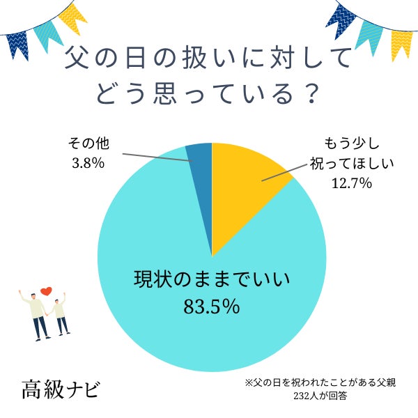 父の日を祝われたことがある父親に対し、父の日の扱いについてどう思っているか聞いたところ「現状のままでいい」が83.5%、「もう少し祝ってほしい」が12.7%でした。