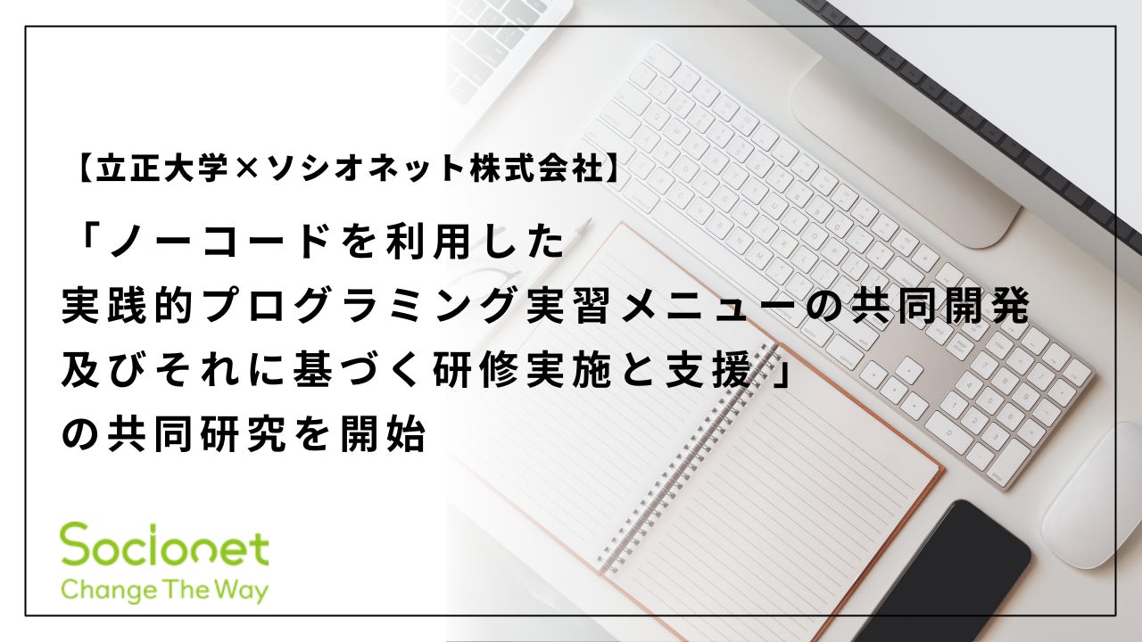 ソシオネットは立正大学との共同研究を通じて「社会課題を解決するDX人材育成」を目的とした、「ノーコードを利用した実践的プログラミング実習メニューの共同開発及びそれに基づく研修実施と支援 」の共同研究契約を締結しました。