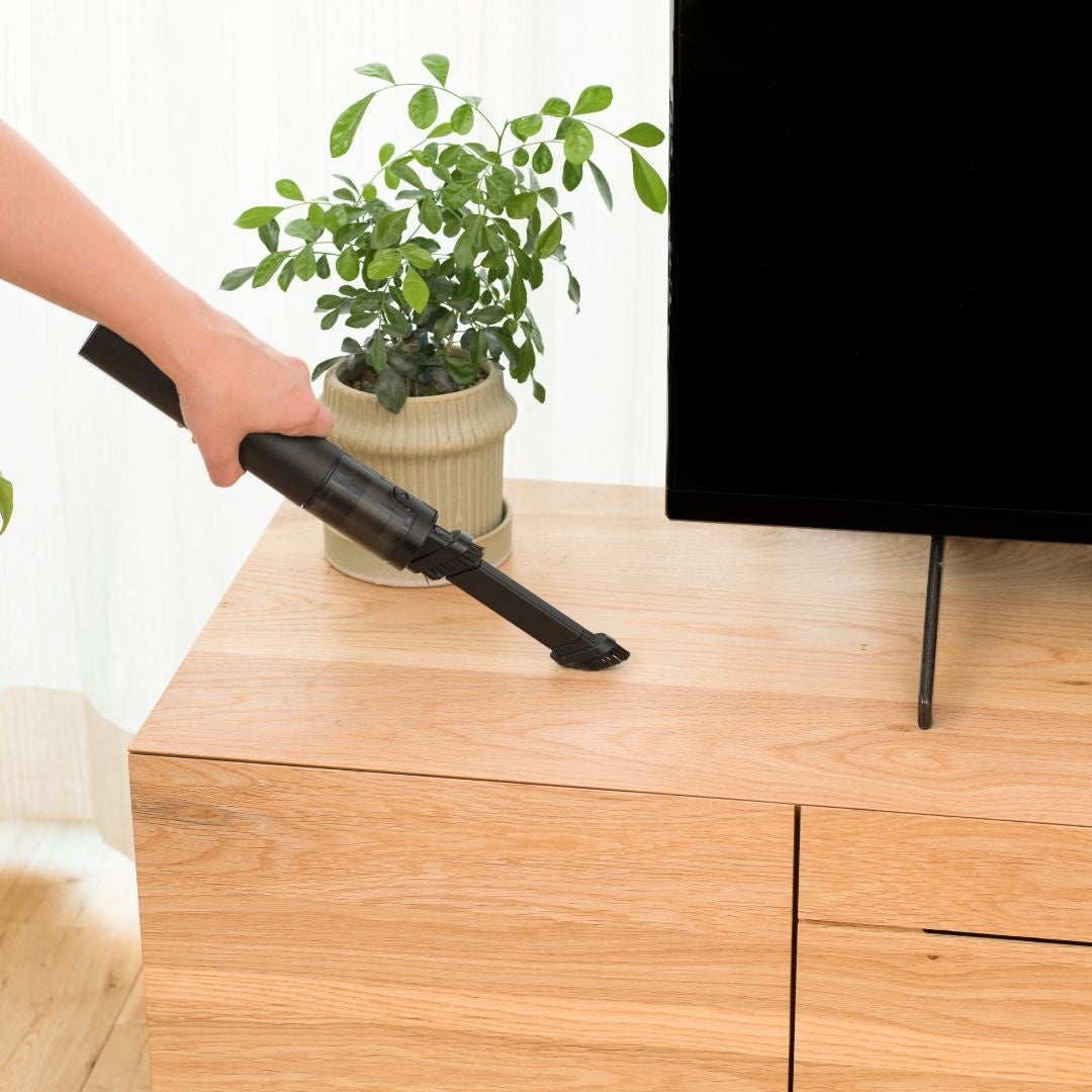 モーターはパワフルなBLDCモーターを採用しており、業界最小クラス(※当社調べ)の充電式ハンディクリーナーです。吸い口はブラシに切り替えられる2in1ノズル仕様で、キッチンカウンターに落ちた乾いたゴミはもちろん、デスク周りや収納スペースの狭いすき間の綿ほこり、隅の掃除に便利です。