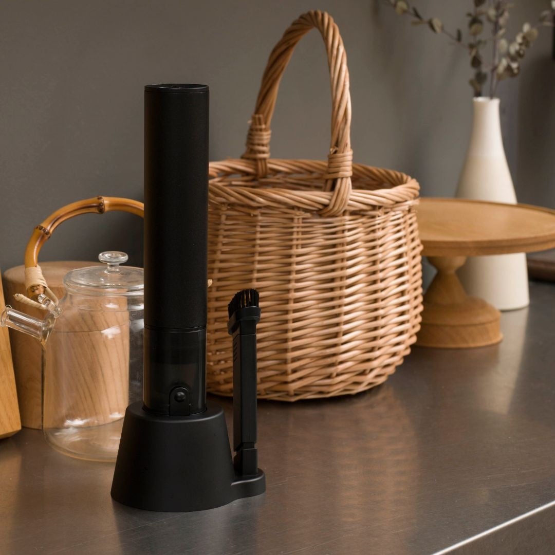 当クリーナーは直径40mm本体重量350gでキッチンラップ程の片手サイズです。付属のスタンドに立て、狭いスペースに収納できます。出したままでも部屋に馴染みインテリアに溶け込むスリムで落ち着いたデザインです。