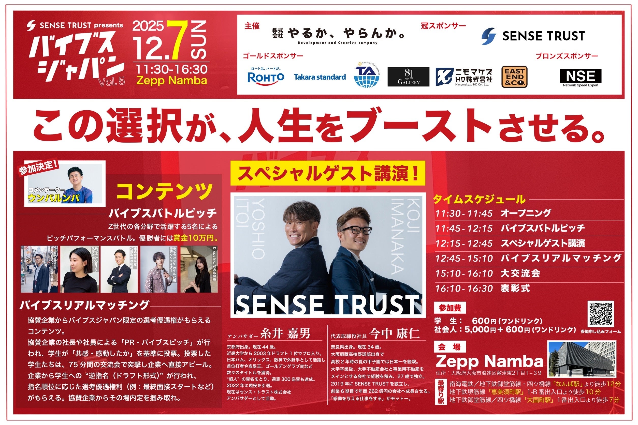 長期インターン紹介マッチングサービス「バイブスインターン」を運営する株式会社やるかやらんか(本社:奈良県橿原市、代表:西 奈槻)は、2025年12月7日(日)、累計2,000名以上の学生が参加してきた関西発の大型キャリアイベント「バイブスジャパンVol.5」をZepp Nambaにて開催いたします。本イベントは、コロナ禍に始まった取り組みから数えて今回で5回目の開催となります。また、本イベントの冠スポンサーには、センス・トラスト株式会社(本社:大阪市、代表:今中康仁)にご協賛いただいております。