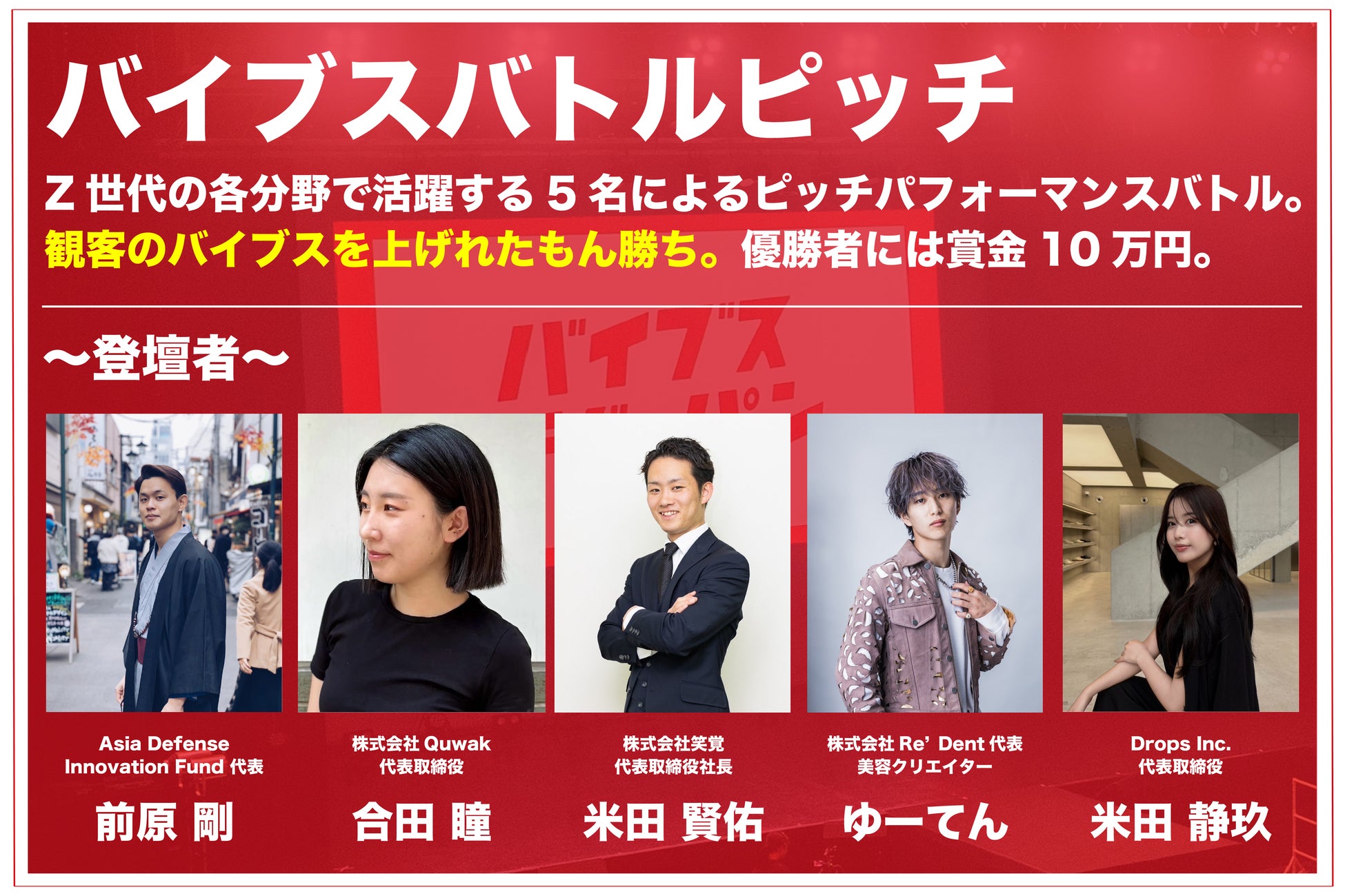 Z世代が、自分の“生き方”と“ビジョン”を4分間に込めて伝える、バイブスジャパンを象徴するコンテンツ。選抜された5名の登壇者が、自己PRでは語りきれない想いや価値観をステージで表現し、それぞれが大切にしている軸や、挑戦する理由、描いている未来を届けます。“目の前にいる観客の心を動かせるかどうか”でが評価基準で、当日は観客によるリアルタイム投票で優勝者が決まります。若者同士が互いの生き方から刺激を受け、「自分も動いてみたい」そう思える空気が会場に生まれる、イベント全体の熱量をつくり出すステージです。