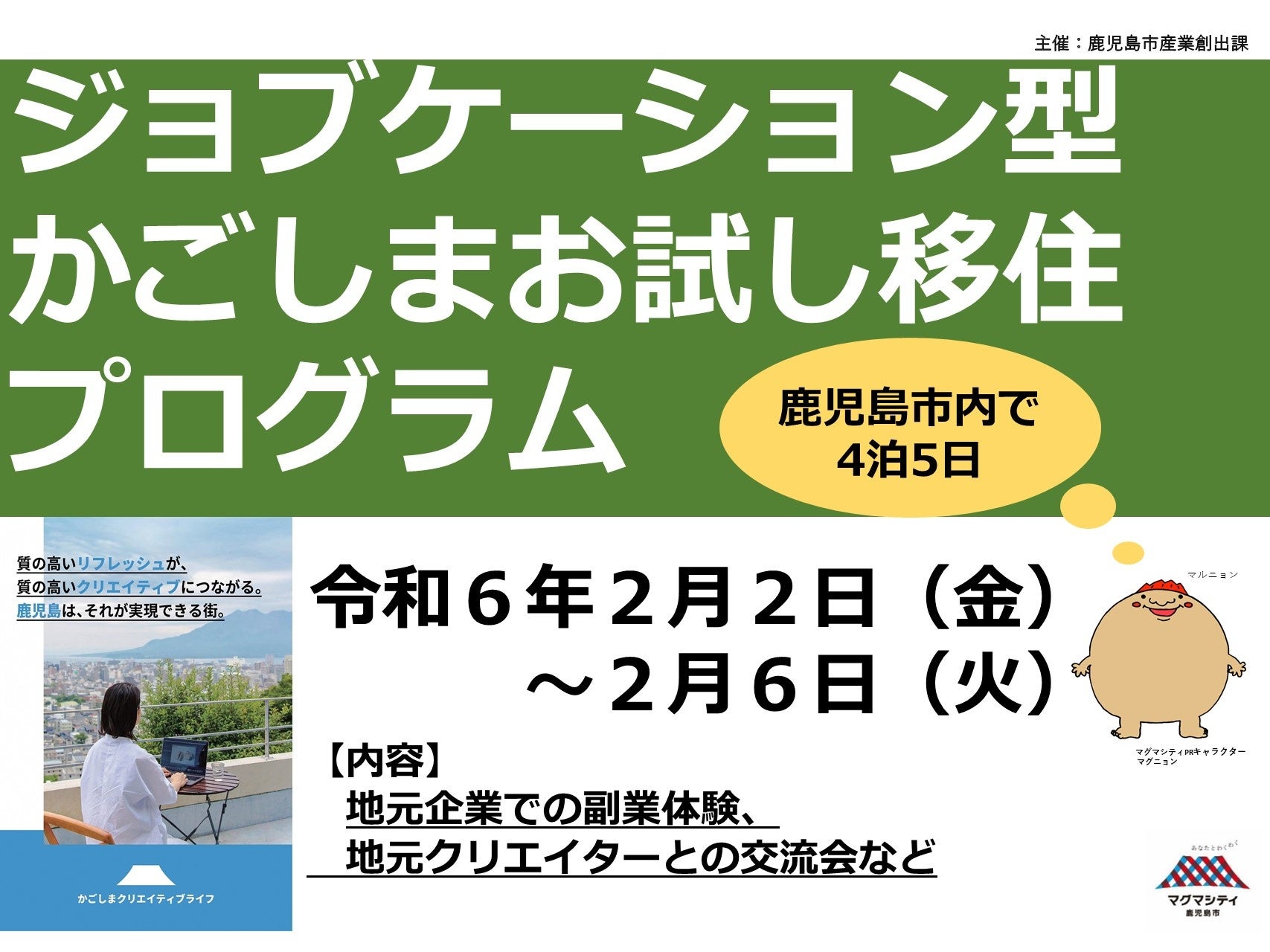鹿児島市では、本市や地方への移住に関心のあるクリエイターの方を対象として、鹿児島市のビジネス環境や生活環境を体験していただける「ジョブケーション型かごしまお試し移住プログラム」への参加者を募集しています。