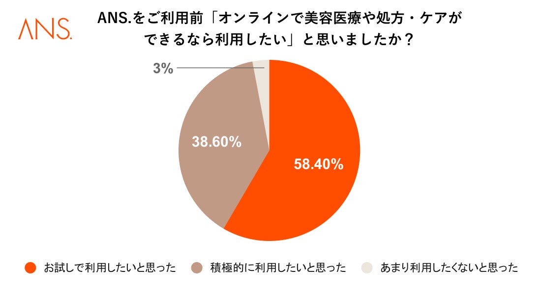 「オンラインで美容医療や処方・ケアができるなら利用したいか?」という質問に対し、「お試しで利用したい(58.4%)」と「積極的に利用したい(38.6%)」を合わせると、約97% の人が興味を持っていることが明らかになりました。