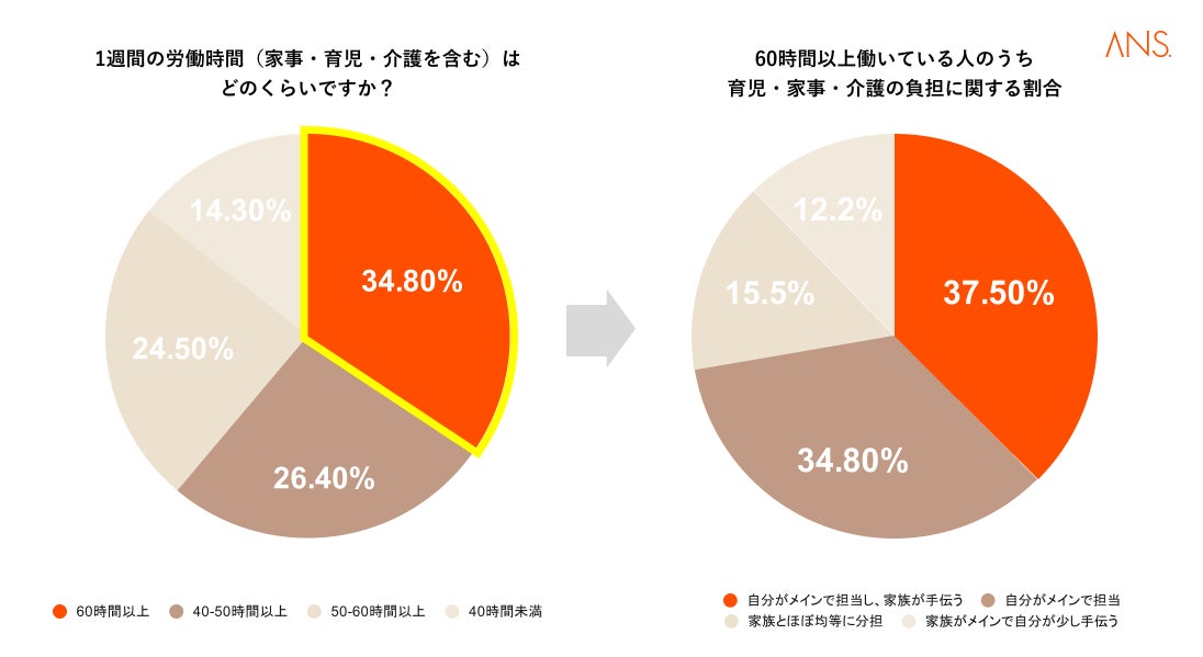 中でも、「60時間以上働いている」と回答した人の約8割が「自分がメインで担当し、家族が手伝う」「自分がメインで担当」しており、仕事に加えて、家庭時間の負担も大きいことが明らかになりました。