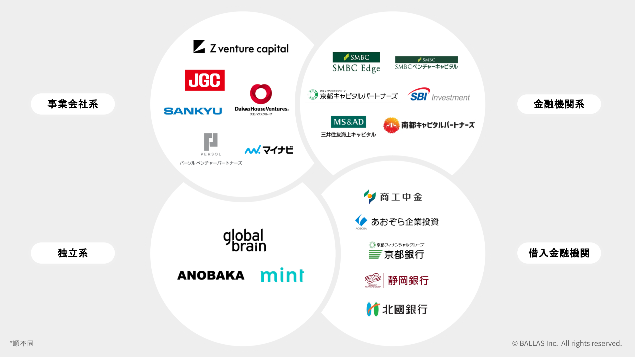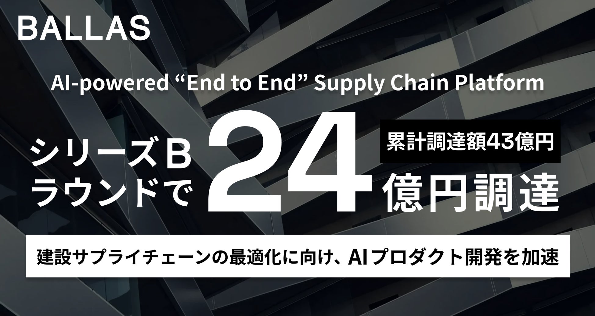 建設部材の最適な調達を起点に、建設業をマス・カスタマイズする株式会社BALLAS(本社:東京都中央区、代表取締役:木村将之、以下「BALLAS」)は、SMBC Edge社およびZ Venture Capital社を共同リード投資家として、シリーズBラウンドでエクイティ21億円、デット3億円、総額24億円の資金調達を実施しました。業界最大となった建設部材オンラインプラットフォームの更なる成長、およびAIプロダクト開発を加速すべく、事業会社・金融機関を中心とした連携体制を構築しています。尚、本調達により累計資金調達額は約43億円となります。