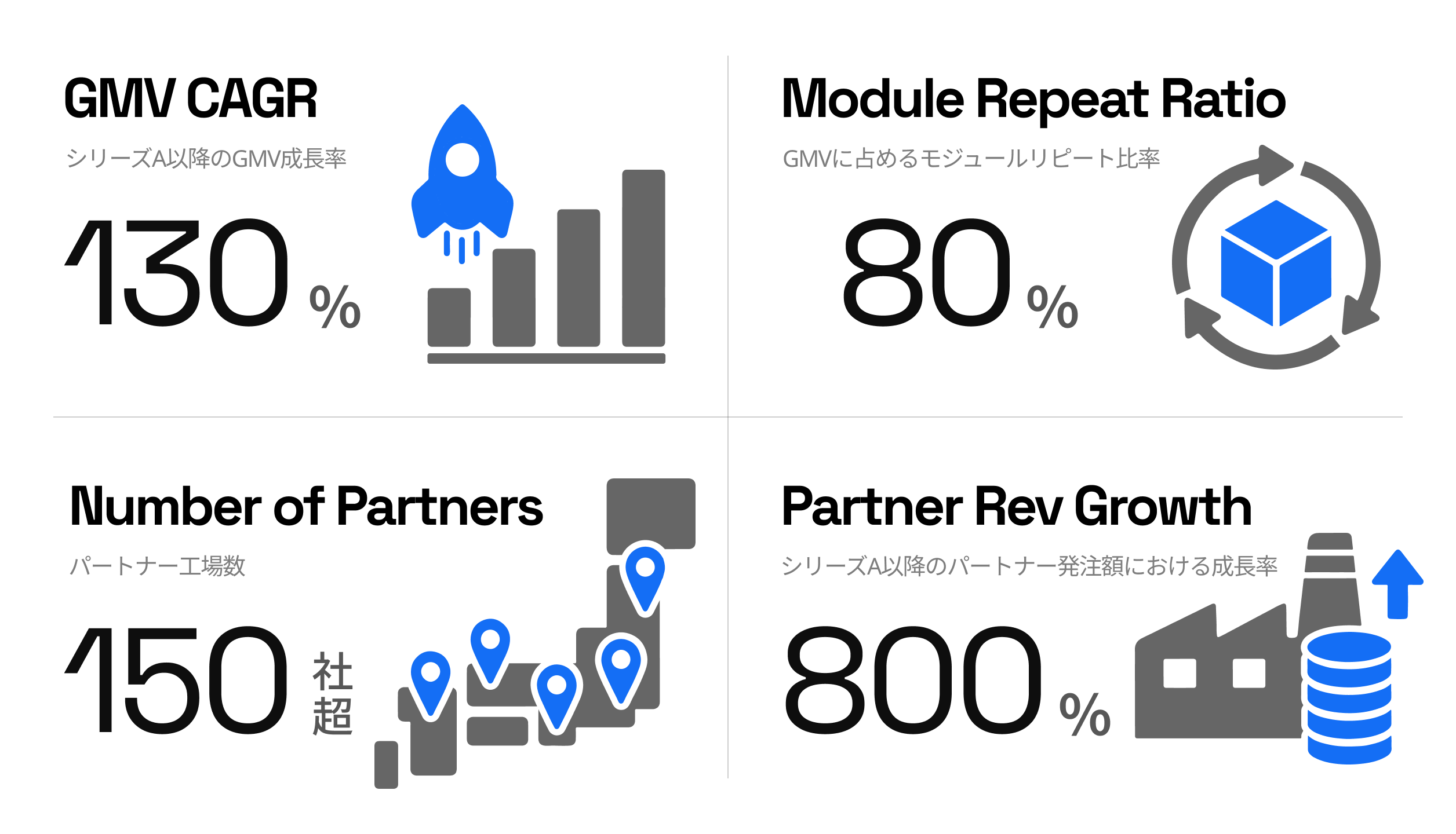 BALLAS SCMは、サプライチェーン上のボトルネックである特注の建設部材をモジュールとして標準化し、カスタマイズしながら繰り返し利用できる仕組みです。従来はデータが資産化されず属人的に対応してきたフローにおいて、建設業の特注性に対応できる形でデータを使い、QCD(Quality:品質、Cost:コスト、Delivery:納期)競争力を向上し続けています。結果として、シリーズAからのGMV成長率はCAGR130%で成長して参りました。