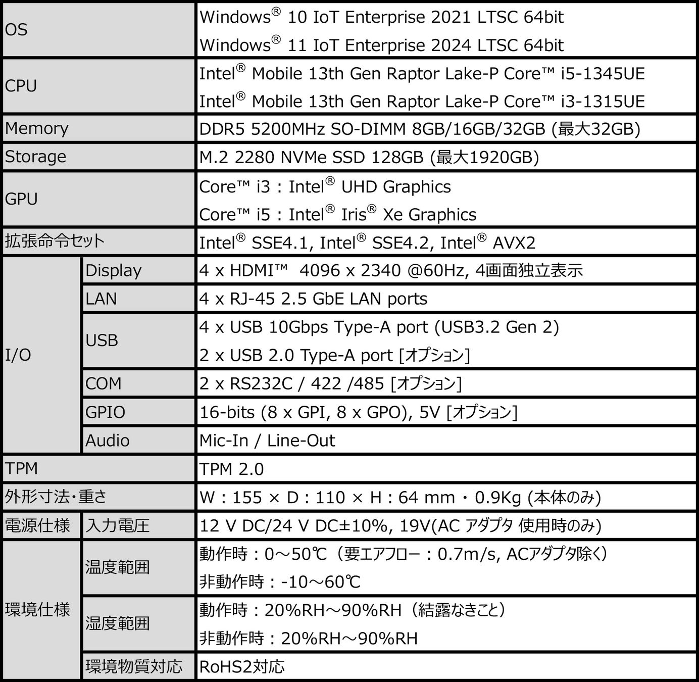 CPUは第13世代 Intel® Core™ プロセッサ(i5 / i3)を搭載。メモリとストレージはDDR5とNVMe SSDを採用し、メモリは最大32GB、SSDは最大1920GBに対応。インターフェースは2.5GbE LAN×4、USB 10Gbps(USB 3.2 Gen 2)×4、オーディオはLine-Out/Mic-Inを装備しています。