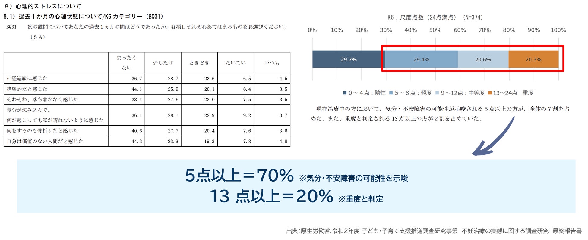 生殖補助医療技術(ART:Assisted Reproductive Technology)の保険適用化により多くの患者の経済的ペインは軽減されました。不妊治療のハードルが下がった一方、治療を受ける患者のデモグラフィック(性別や年齢などの統計学的な属性)は多様化し、より情報の非対称性を埋める患者教育を含む意思決定支援や、心理介入はより重要性を増しています。厚生労働省の2021年「不妊治療の実態に関する調査研究」によると、患者に実施したK6スコア(うつ病・不安障害などの精神疾患をスクリーニングすることを目的として、Kesslerらが開発した6項目からなる尺度で、メンタルヘルスの状態を示す指標)の結果を見ると、気分・不安障害の可能性が示唆される5点以上の患者が、全体の7割、重度と判定される 13 点以上が2割を占め、心理介入の重要性が示唆されました。一方で、「保険適用下での治療中において、カウンセリングは実質無償で提供されなければならない」といった通達が出されています。