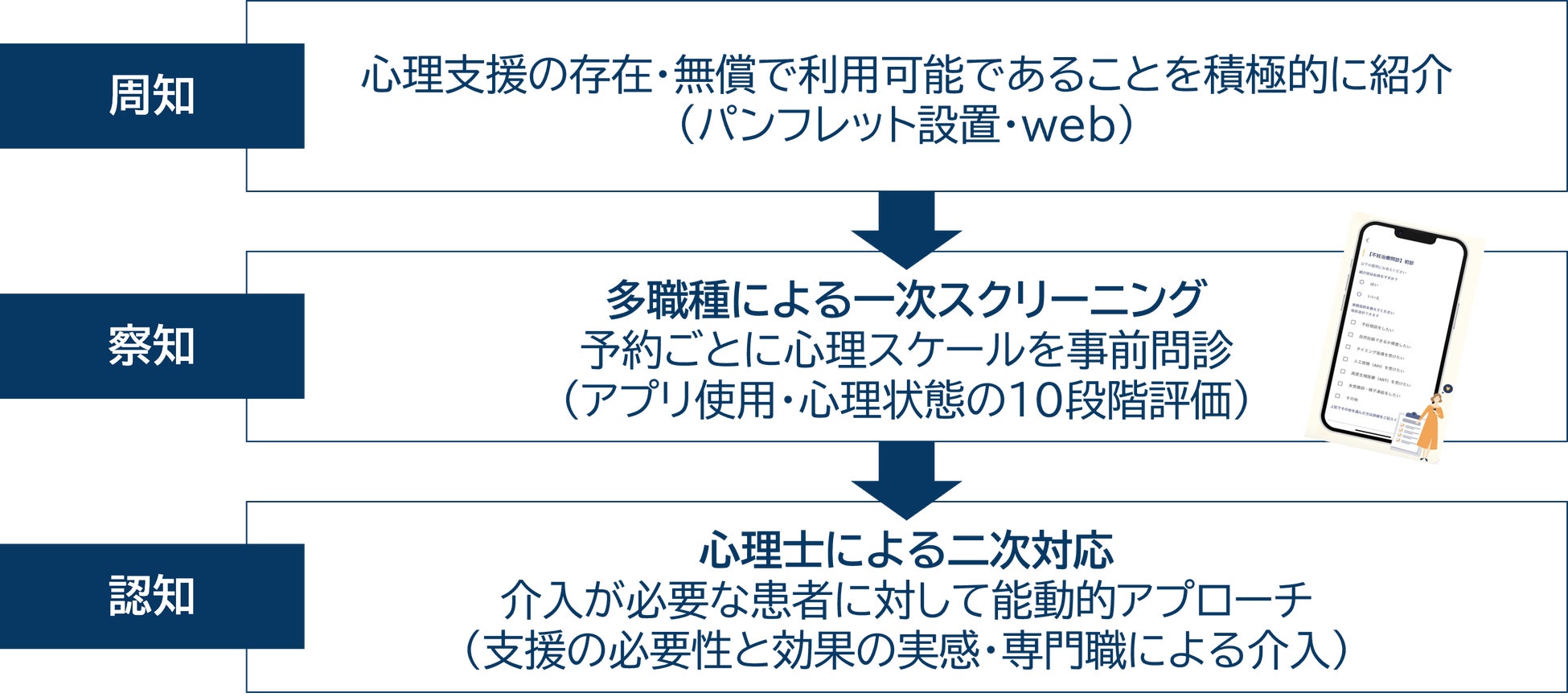 一般診療でよく使用される疼痛の評価スケールの視覚的評価スケール(VAS: Visual Analogue Scale)や数値的評価スケール(NRS:Numeric Rating Scale )を参考に、心理状態を10段階でアプリから予約毎に事前問診することで、回答負荷を軽減し、全患者の全診療時の状態を把握可能な形に設計しています。さらに院内全てのスタッフが共通して把握できることで、スタッフの患者対応の質の向上が見込め、患者が受付してから帰宅するまでの間に、複数職種による察知の機会を設けることで、心理職への二次対応に円滑に繋げられると考えます。