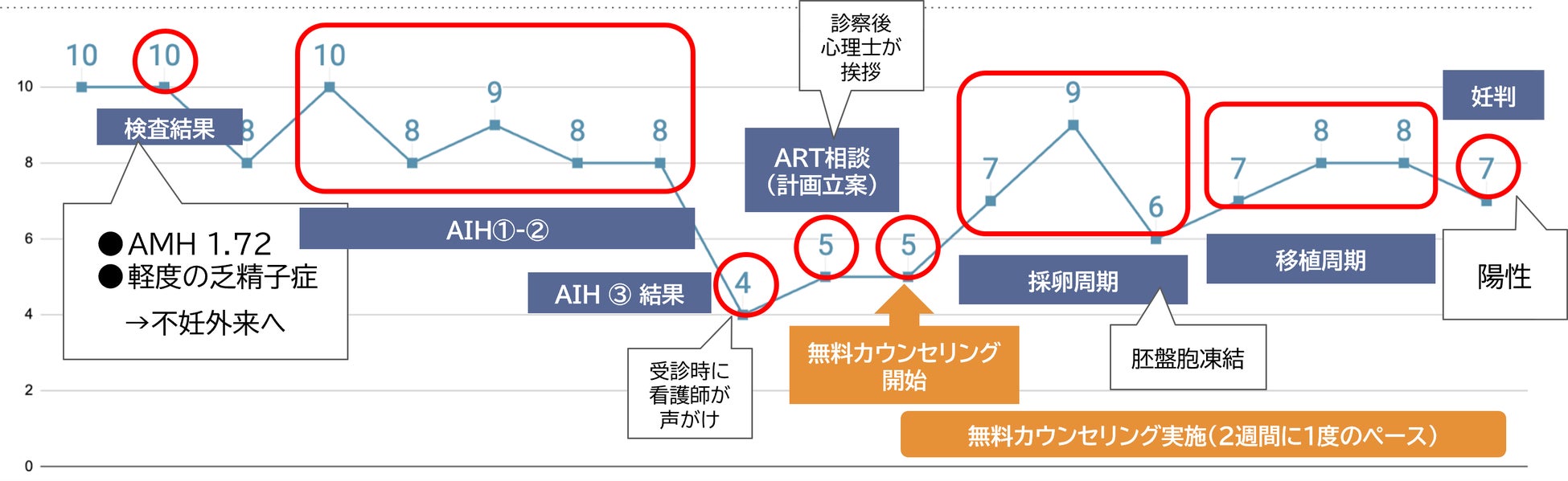 初診時は「不安もなく、元気で安定している」のスコア10と回答し、プレコンセプションケア外来を受診。結果はAMH 1.72と中央値よりやや低下、軽度の乏精子症のみを認めました。2人挙児希望であるため、1人目の妊活を2年→不妊治療→妊娠→出産→授乳までのロードマップの例を提示。各種妊娠方法の妊娠率などを説明。2週間後の不妊外来では心理スコア8とやや不安は感じていたものの、人工授精(AIH:Artificial Insemination of Husband)で妊娠する90%が3〜4回で妊娠するというデータをベースに、まずAIH4回を実施する方針となりました。AIH1回目、2回目を実施する際は心理スコア8-10と安定していました。しかしAIH3回目実施時は心理スコアが4と急低下。医師、看護師が察知し、心理状況のヒアリング、当院に心理士が常駐していることをお伝えし、治療の長期化、就労との両立性の困難の自覚があることを聴取。ART希望を認めたためART説明外来及びカウンセリングパンフレットお渡ししたところ、カウンセリングを希望したため心理士を紹介・挨拶しました。ART周期開始前より心理士による心理介入を開始。心理介入の開始後もスコアは毎回取りますが、その変化に重きはおいていません。2週間に1回程度の頻度で無料カウンセリングを実施し、無事卒業を迎えたケースを挙げさせていただきましたが、本モデルケースのようなタイムラインをたどる患者様は多く、⼀次スクリーニングから適切に⼆次対応に繋げることは大変重要です。