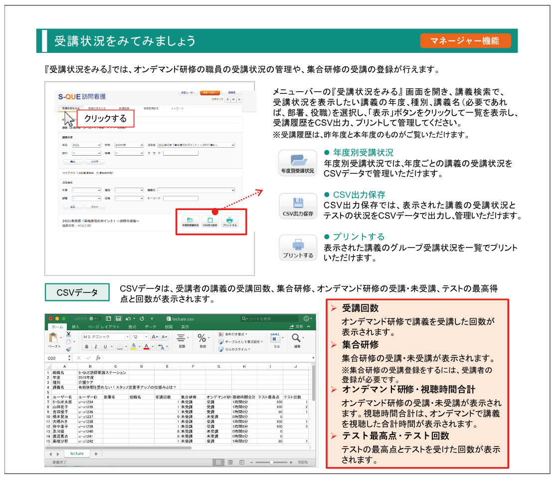 管理者はスタッフがいつどの内容をどれくらい学習したのか、それに関しての習熟度がどうだったかの『研修受講記録』を見て把握する事が出来ます。一方、スタッフは自分がどこまで何を勉強したのかを管理しながら学習でき、訪問看護師として何を勉強すべきなのかを把握しながら自分のタイミングで学習を進めることができます。
