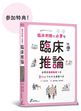 本研修に参加いただいた方には、書籍『看護学生のための臨床判断に必要な臨床推論』(道又元裕監修 2023年3月刊行)の電子書籍版が全頁ご覧いただけるURLをお送りいたします。ご希望の方には受講後に閲覧用パスワードをお送りいたします。