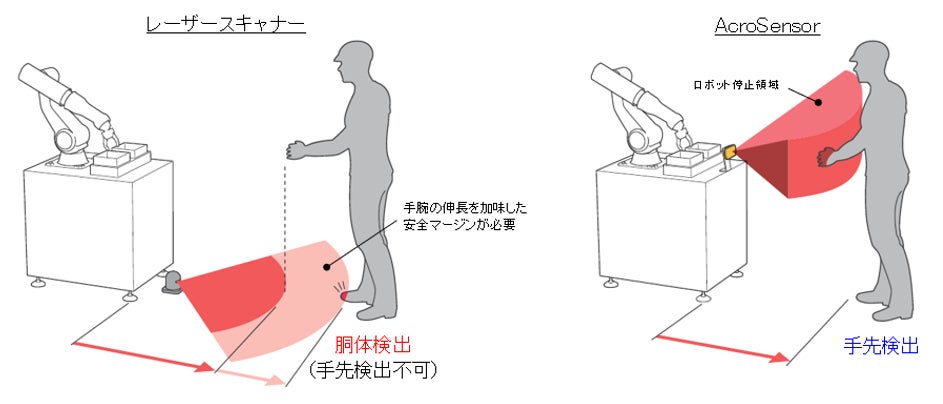 『AcroSensor』は、国内では初めての“安全認証を取得した3D安全センサー”(*1)です。ミリ波レーダーを活用した3D検知技術を用いることで協働ロボットに接近した人を適切な距離で検知するため、従来方式(*2)の安全センサーに比べてロボットが停止する領域(ロボット停止領域)を狭く設定することができます。協働ロボットの安全センサーとして用いることで、人がロボットに接近した際に検出される過剰な一時停止(チョコ停)を減らし、ロボットの生産性向上に貢献します。