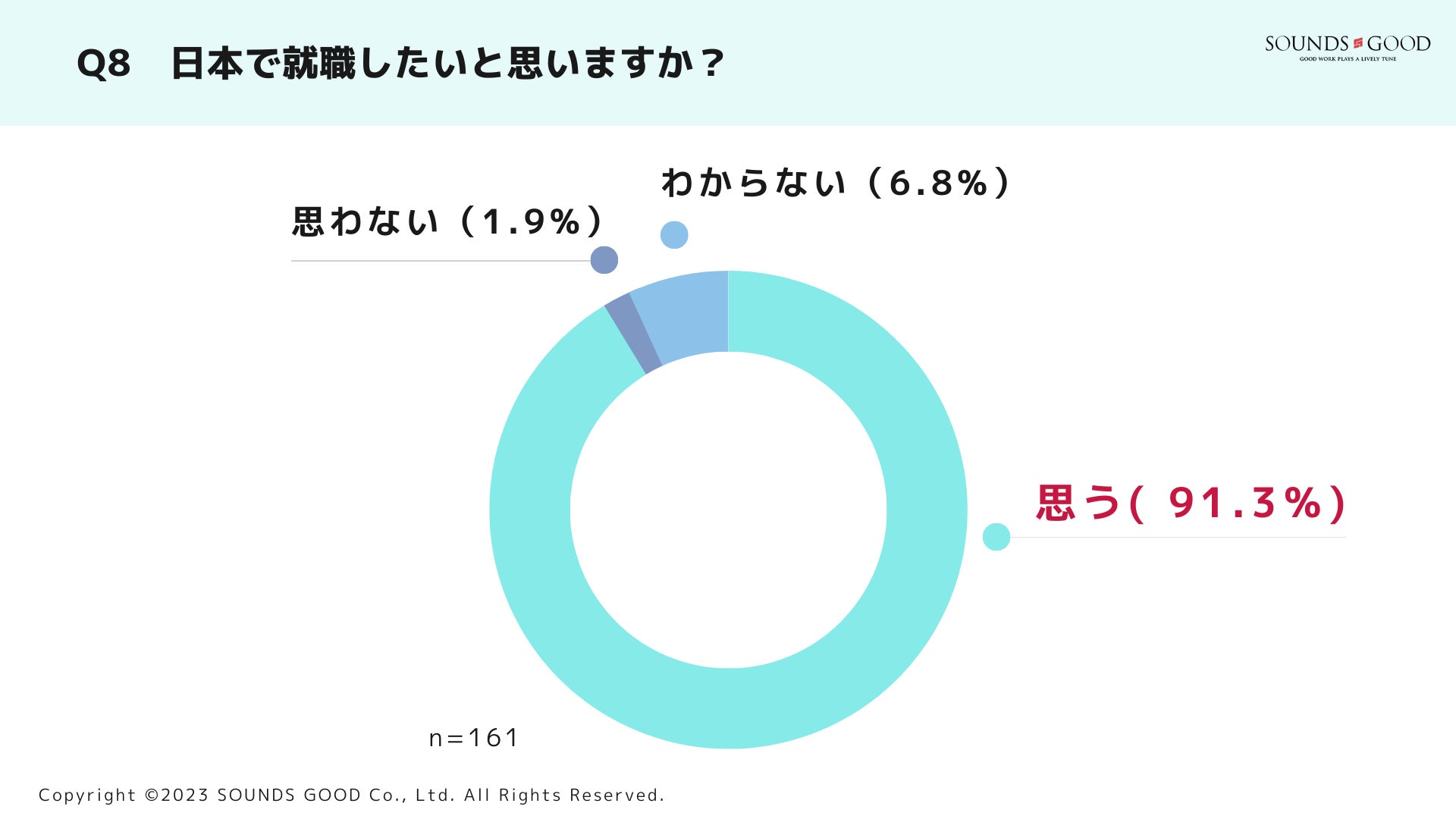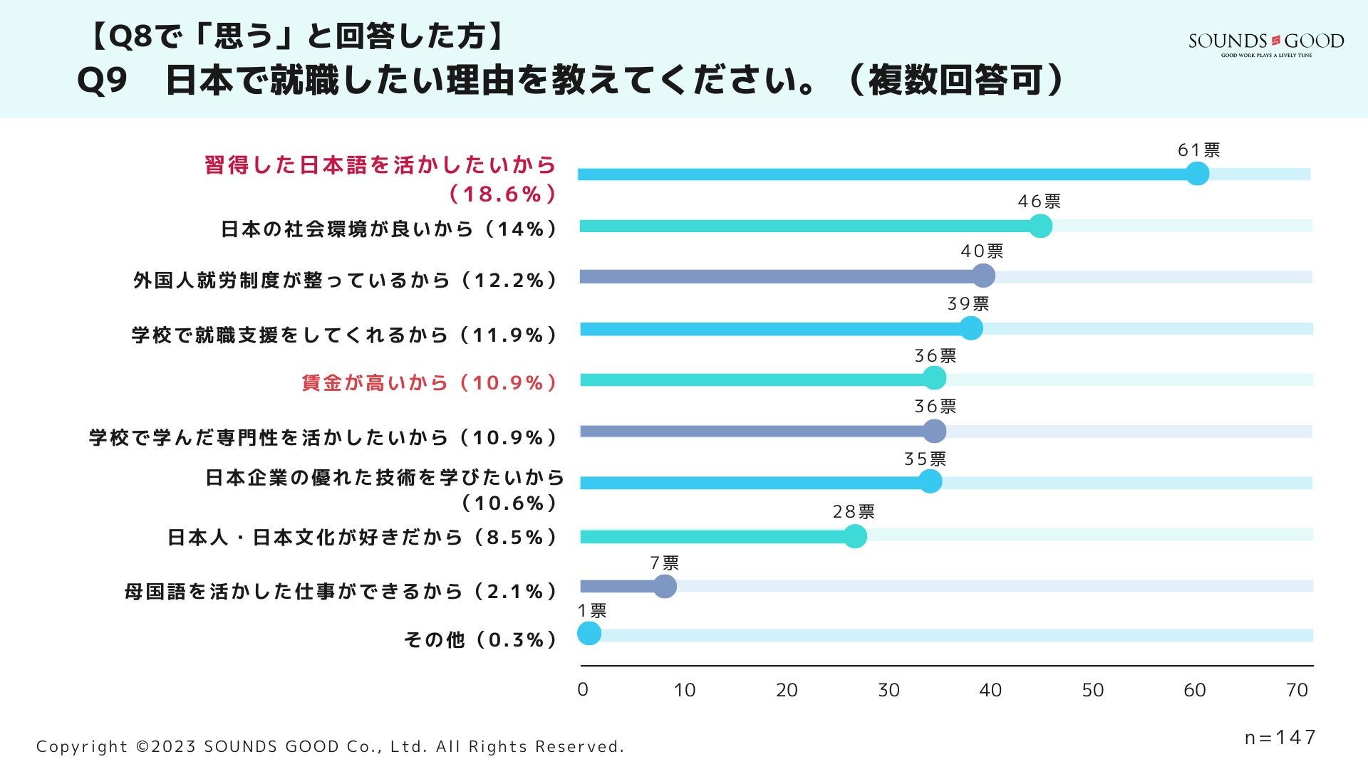 前問で「思う」と解答した147名にその理由を伺うと、「日本語を活かしたいから」が61票で首位となり、母国比較では"高い"とされた賃金に関する支持は、回答数全体の10%(36票)に留まりました。
