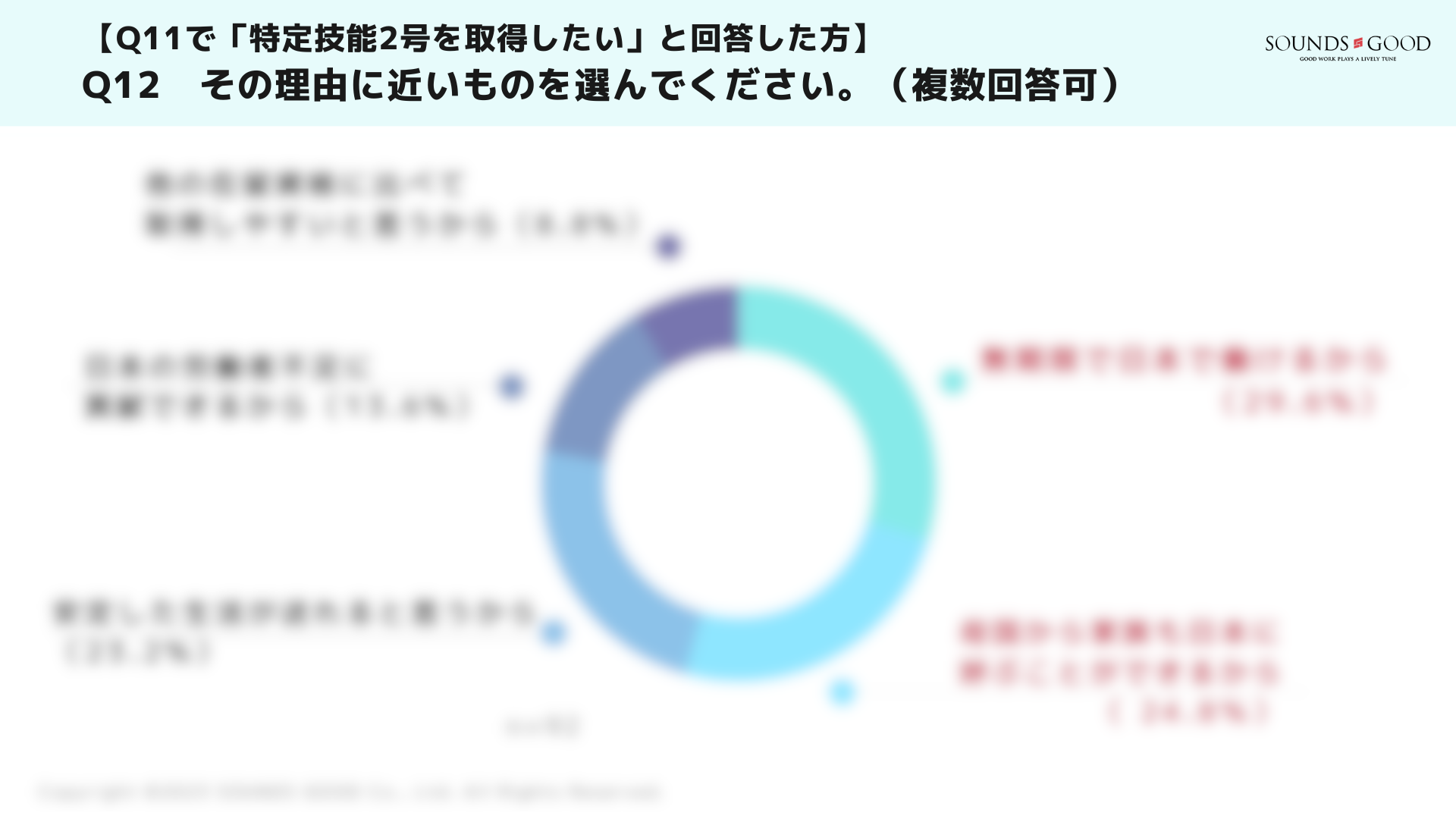 また、今年6月に対象拡大が発表された「特定技能2号」について伺うと、合計57.1%が「取得したい」と答え、そのうちの約半数は、対象分野が拡大したことで取得への意欲が起きたことがわかりました。