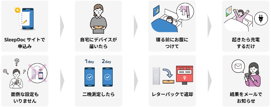 ※2 本サービスは医療行為を行うものでも、医療機器を提供するものでもございません。詳細は本サービスの睡眠障害リスクの計測方法について(https://sleep-doc.jp/#notes)をご参照ください。