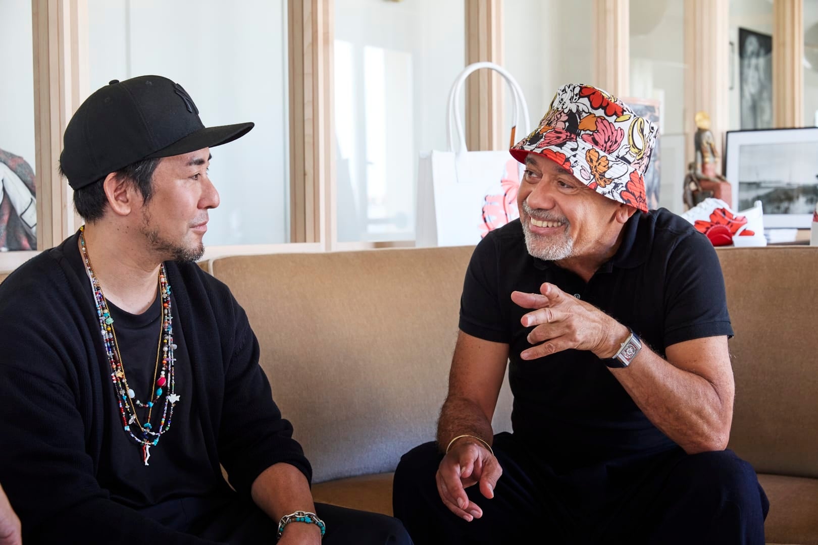 「私はShun Sudoの作品を愛してやみません。コレクションの開発段階で、我々が共に力強く大胆な組み合わせのカラーを多用するなど多くの共通点を発見しました。そして私の初期の作品の象徴的な花、Pansee(パンジー、私の最初のレッド ソールのデザイン)、そして彼にも彼独自の花、コレクションの中心として表現されるButton Flowerがあります。彼の技術はとても特徴的で、私はシューズにこのペインティングの効果を最大限に再現するよ