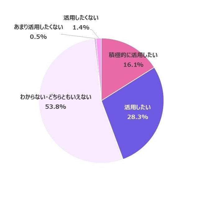 「積極的に活用したい」・「活用したい」という方が全体の44.4%いるのに対し、「わからない・どちらともいえない」が53.8%、と多くを占めるも、「あまり活用したくない」・「活用したくない」といった消極的な意見はあわせて1.9%しかなく、フェムテックの必要性は認めつつも、有用性を感じていない現状があるようなデータとなりました。
