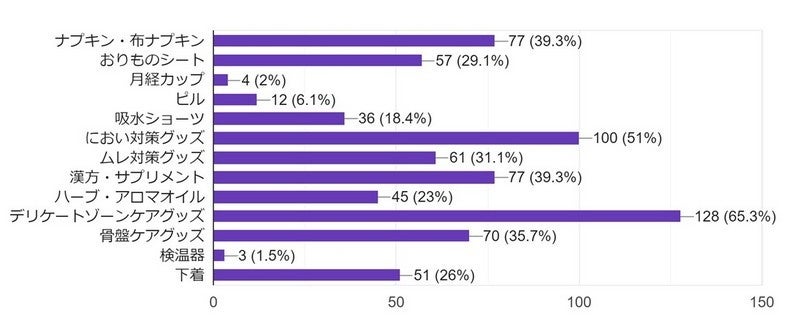 「積極的に活用したい」・「活用したい」と答えた方への質問として、どのような製品を求めているか質問したところ、「デリケートゾーンケアグッズ(65.3%)」がトップ、次いで「におい対策グッズ(51%)」、「ナプキン・布ナプキン(39.3%)」、「漢方・サプリメント(39.3%)」と続きました。一カ月当たりの購入予算は「1,000円-5,000円」が最も多く64.3%となり、決して少なくない予算を毎月の費用として使用していることがわかりました。