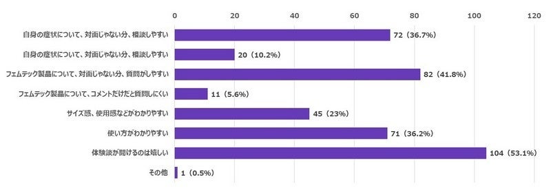 ユーザーはフェムケアとライブコマースの関係について、「自分の症状について対面じゃない分、相談しやすい」・「フェムテック製品について対面じゃない分、質問しやすい」、「体験談が聞けるのは嬉しい」・「使い方がわかりやすい」など、ライブコマースならではの非対面の双方向性コミュニケーションを評価しており、購入のしやすさに繋がっているものと考えられます。