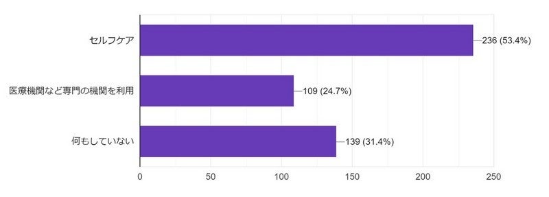 それらの症状に対し、「セルフケア(53.4%)」や「医療機関など専門の機関を利用(24.7%)」して、対策する方が多くいる一方で「何もしていない」と答えた方が31.4%もいることがわかりました。