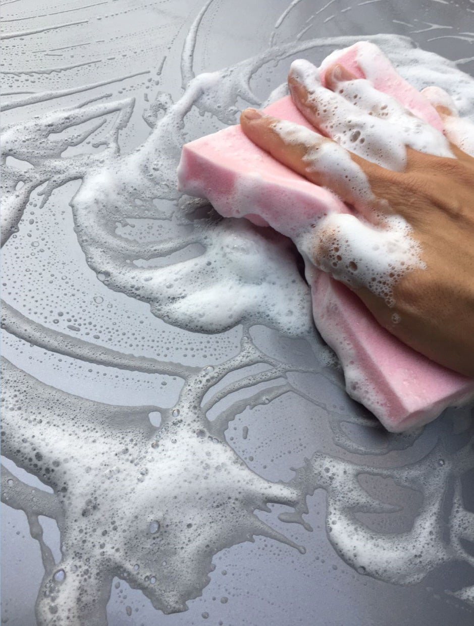 5)水をかけながらボディをスポンジで軽くこすってください。その後、十分な水ですすいでください。