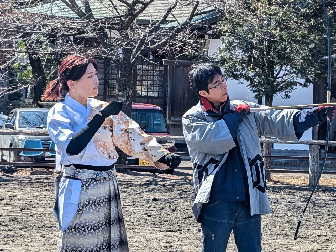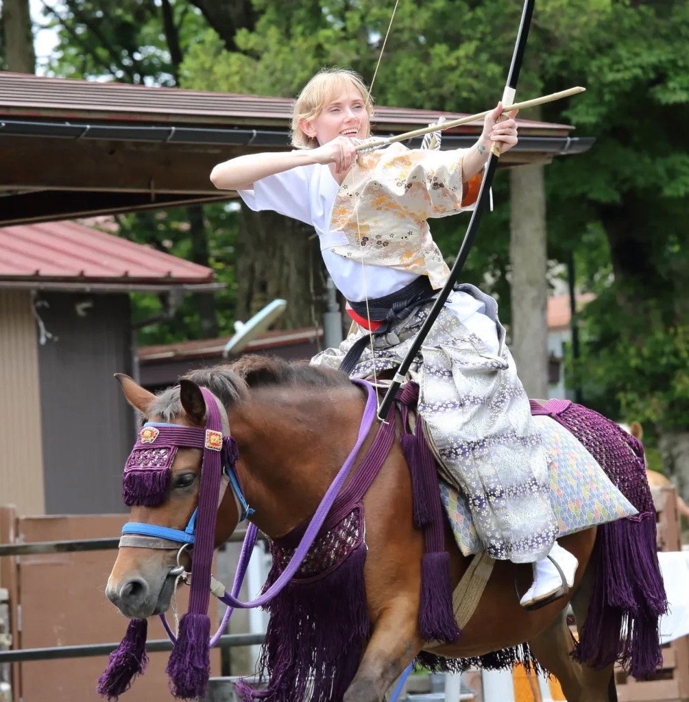伝統的な騎射装束への着替え(15分)→馬とふれあい、信頼関係を築く(15分)→弓の構えと射法の練習(15分)→馬上での基本練習(30分)→実践! 馬上から矢を射る(45分) 全体で2時間程度です。