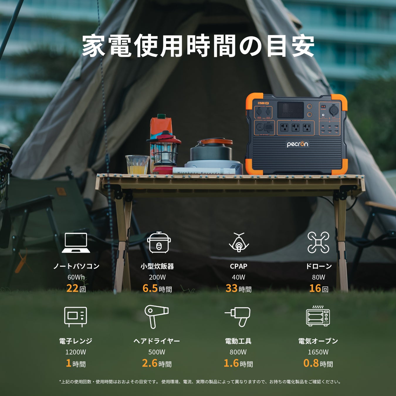 PECRON E1500LFPは、2200Wの高出力と1536Whの大容量を兼ね備えているため、定格出力2200W以下の電子レンジ、電気ケトル、電気オーブン、ヘアドライヤー、炊飯器、コーヒーメーカー、冷蔵庫、洗濯機、電気毛布、電動工具、CPAP、スマートフォン、パソコンなどの電気製品に給電できます。