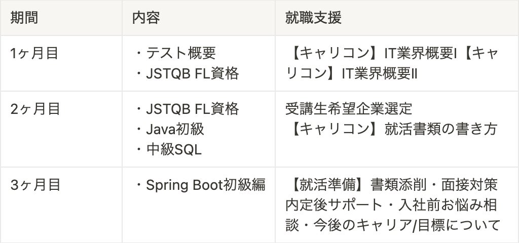 本コースは、未経験者が数ヶ月でソフトウェアテストの実践的なスキルを習得し、資格取得も同時に目指しながら、実務で活躍できる人材を輩出することを目標としています。
